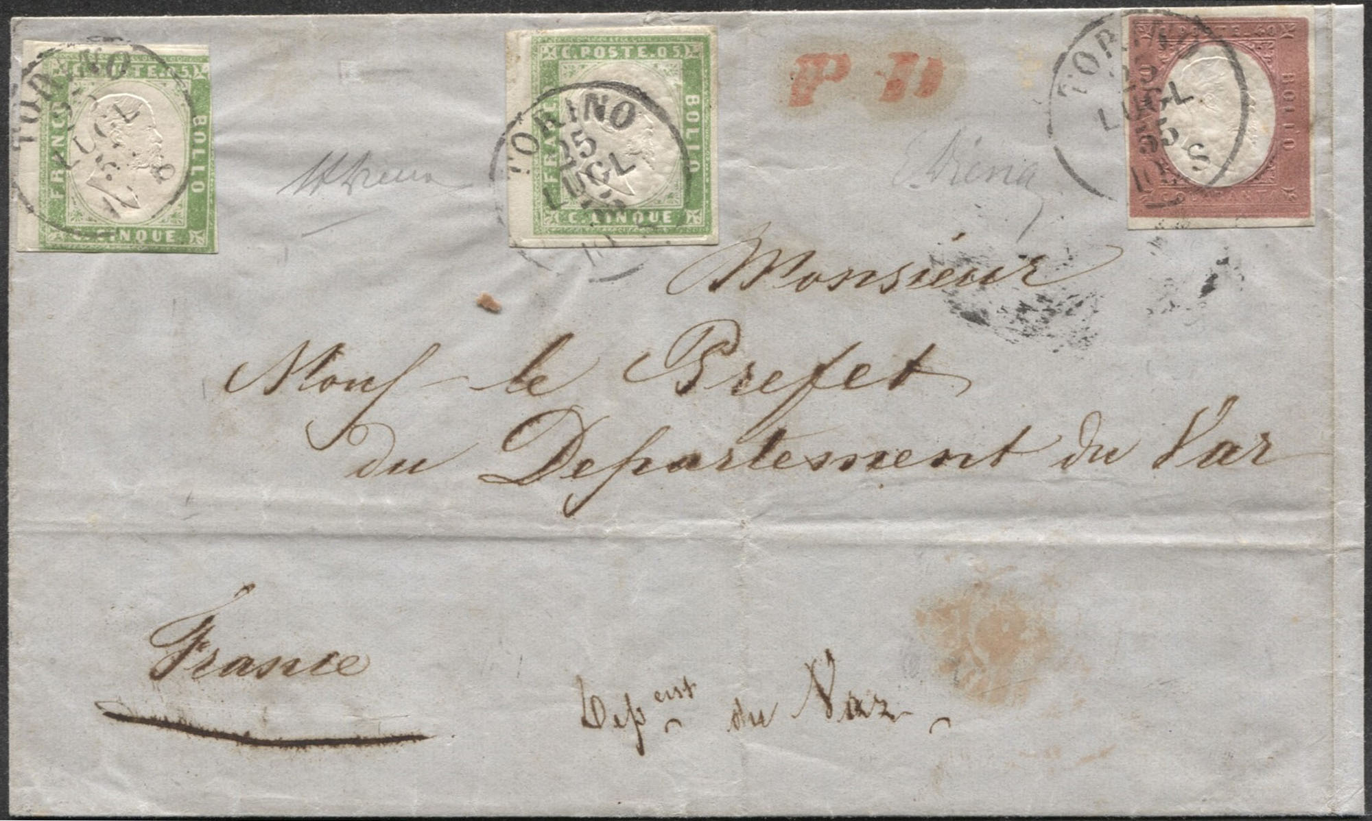 Antichi Stati Italiani - Sardegna - Lettera (9 + 13a + 13a)Fresca lettera da Torino 25.7.55 per la Francia affrancata con 40 cent rosso mattone + 2 es. (1 toccato) del 5 cent verde giallo - mista III°/IV° emissione - RARITA' D'EFFETTO - Em.D + cert. AD - (9 + 13a + 13a)