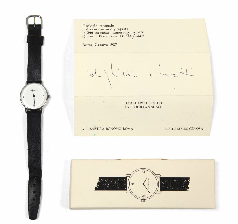 ALIGHIERO BOETTI (1940 - 1994) Orologio annuale Alighiero Boetti 1987 esemplare 47/200 inserito nella custodia originale, firmata dall'artista edizioni Alessandra Bonomo, Locus Solus, Genova Annual wrist watch by Alighiero Boetti 1987 edition 47/200 included in its original box, signed by the artist Alessandra Bonomo editions, Locus Solus, Genova
