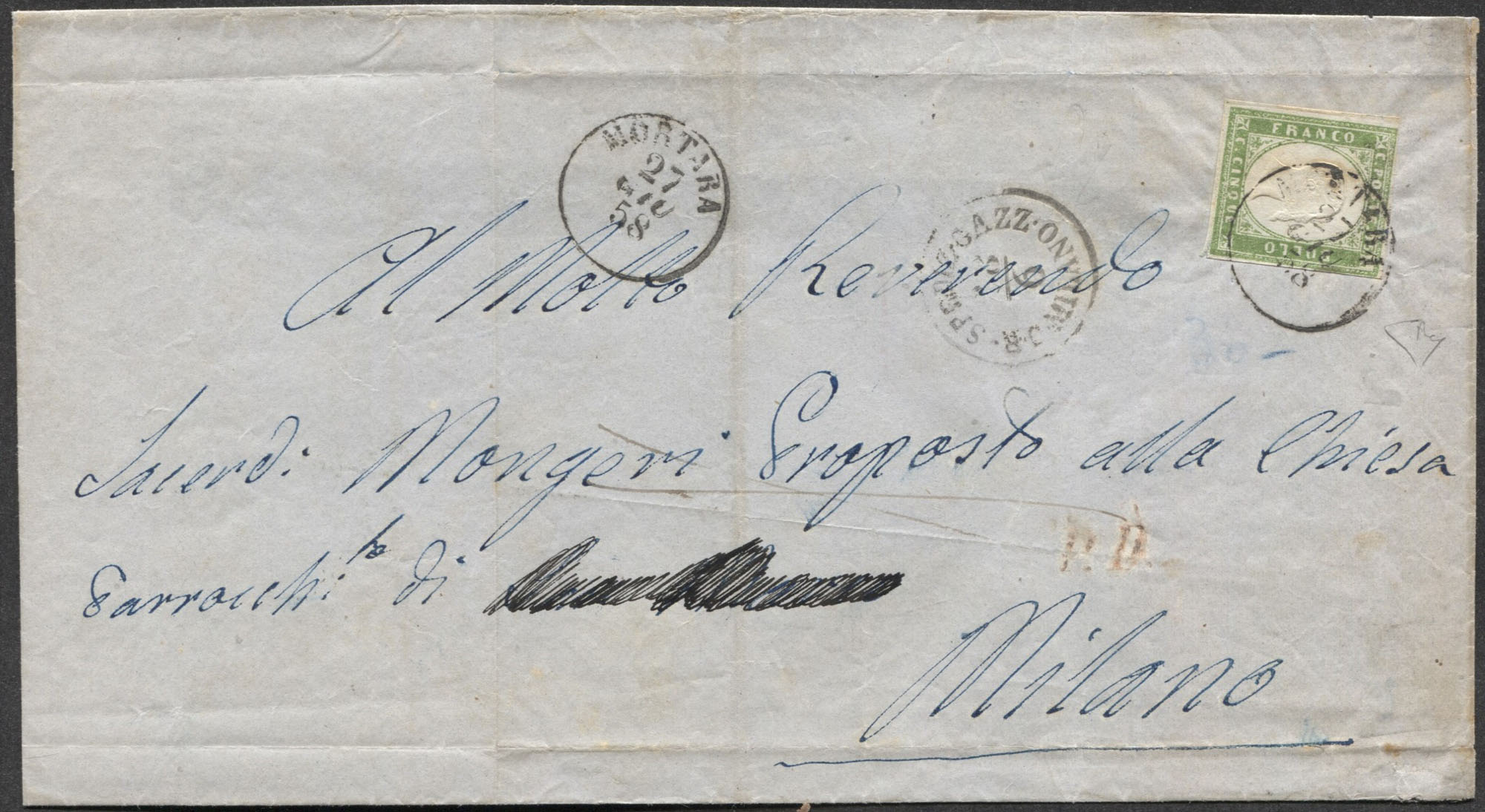 Antichi Stati Italiani - Sardegna - 5 cent (13AD)Fascetta per stampati da Mortara 27.6.58 per Milano affrancata con 5 cent verde giallo con buoni margini - annullo in CS senza ore (P.ti R1) - PEZZO UNICO - cert. ED - (13AD)