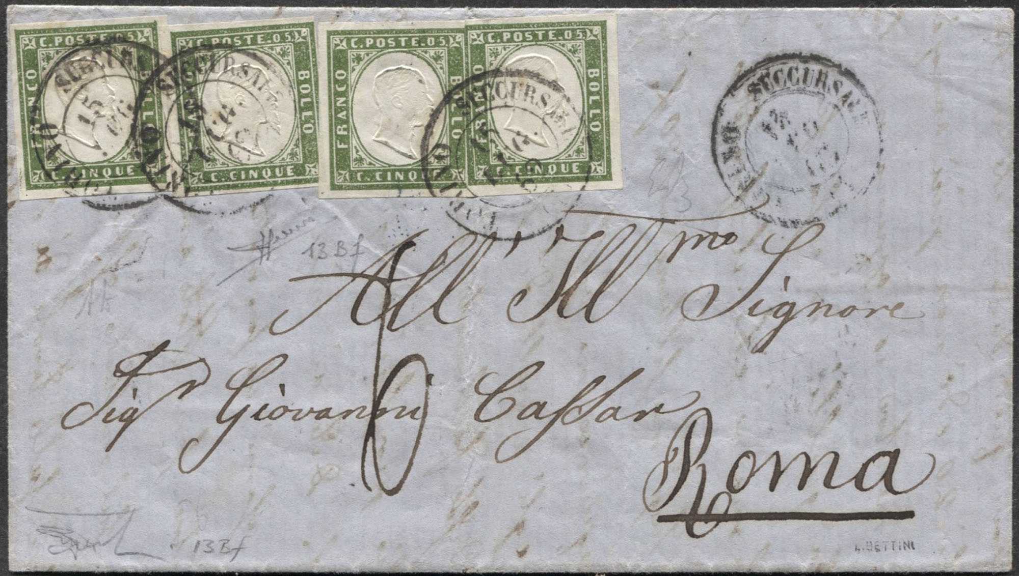 Antichi Stati Italiani - Sardegna - Lettera (13Bf)Eccezionale lettera da Torino Succursale (1) 15.7.62 per Roma affrancata con 4 es. del 5 cent verde oliva scuro tutti bene marginati - eccezionale - RARISSIMO INSIEME - ex Bettini - Bottacchi + cert. Sorani - (13Bf)