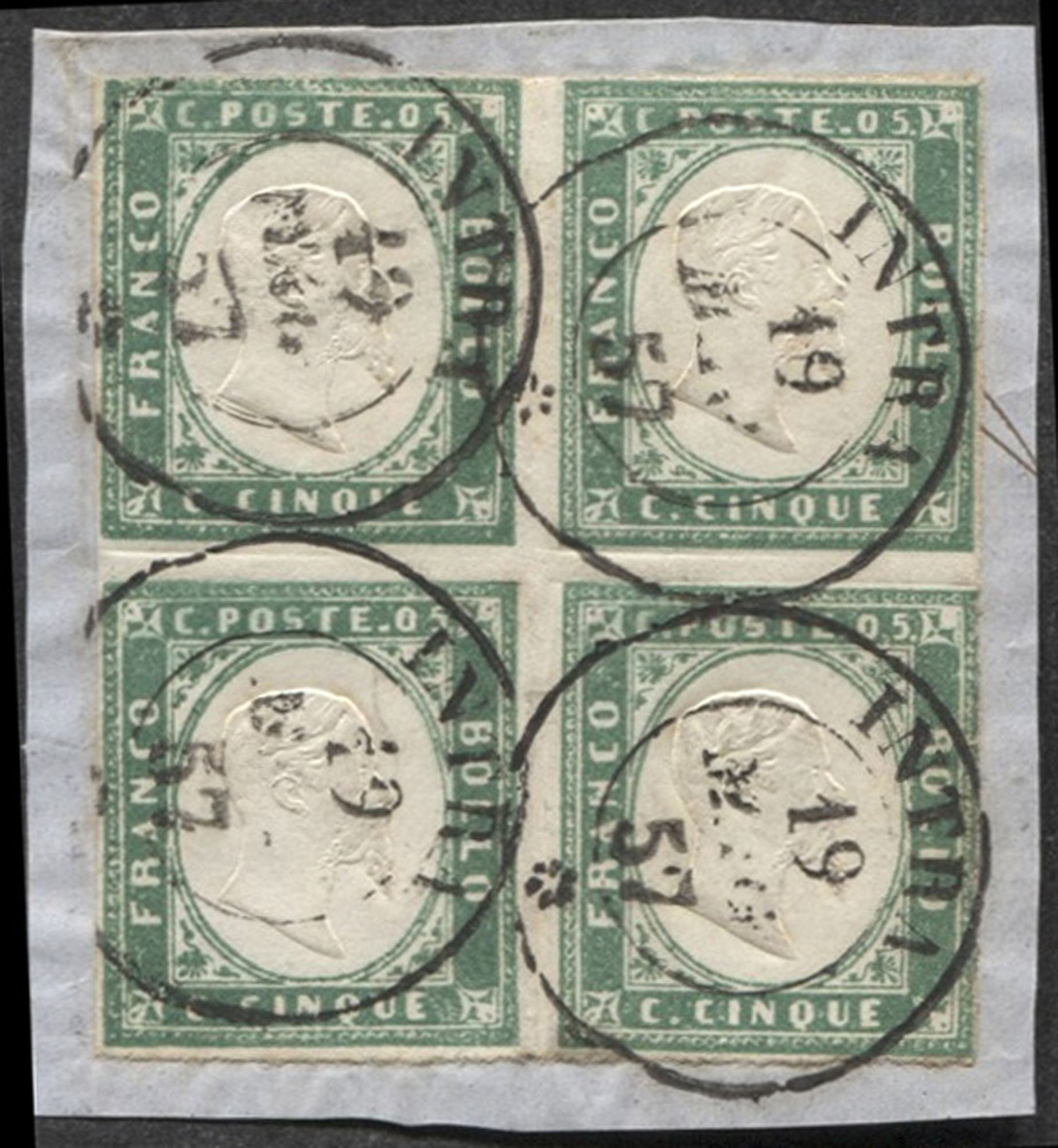 Antichi Stati Italiani - Sardegna - 5 cent (13D)Frammento con blocco di quattro del 5 cent verde smeraldo - Intra 19.5.57 in D.C. - rarità - AD + Oliva + cert. Sorani - (13D)
