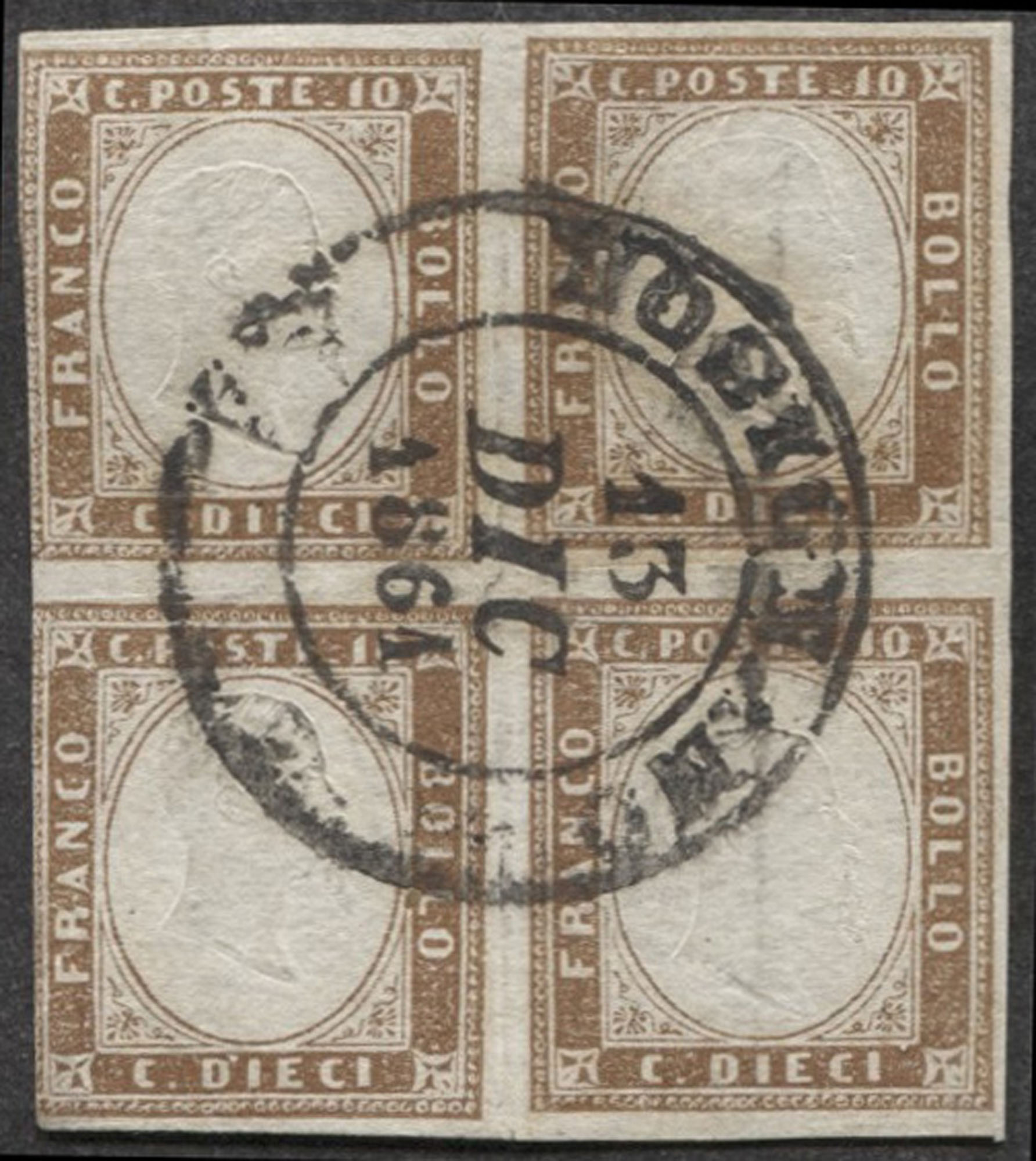 Antichi Stati Italiani - Sardegna - 10 cent (14Ck)Blocco di quattro del 10 cent bruno cioccolato chiaro rasente a sinistra - Rosignano 14.12.61 in DC grande - probabilmente unico - AD + Colla - (14Ck)