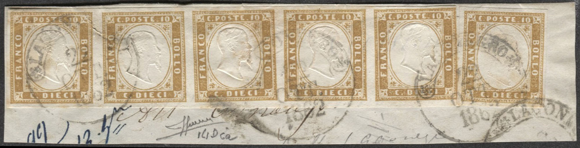 Antichi Stati Italiani - Sardegna - 10 cent (14Dca)Frammento con striscia di cinque più es. del 10 cent bistro giallastro - buoni margini - Lagonegro 22.10.62 - raro - Sorani - (14Dca)