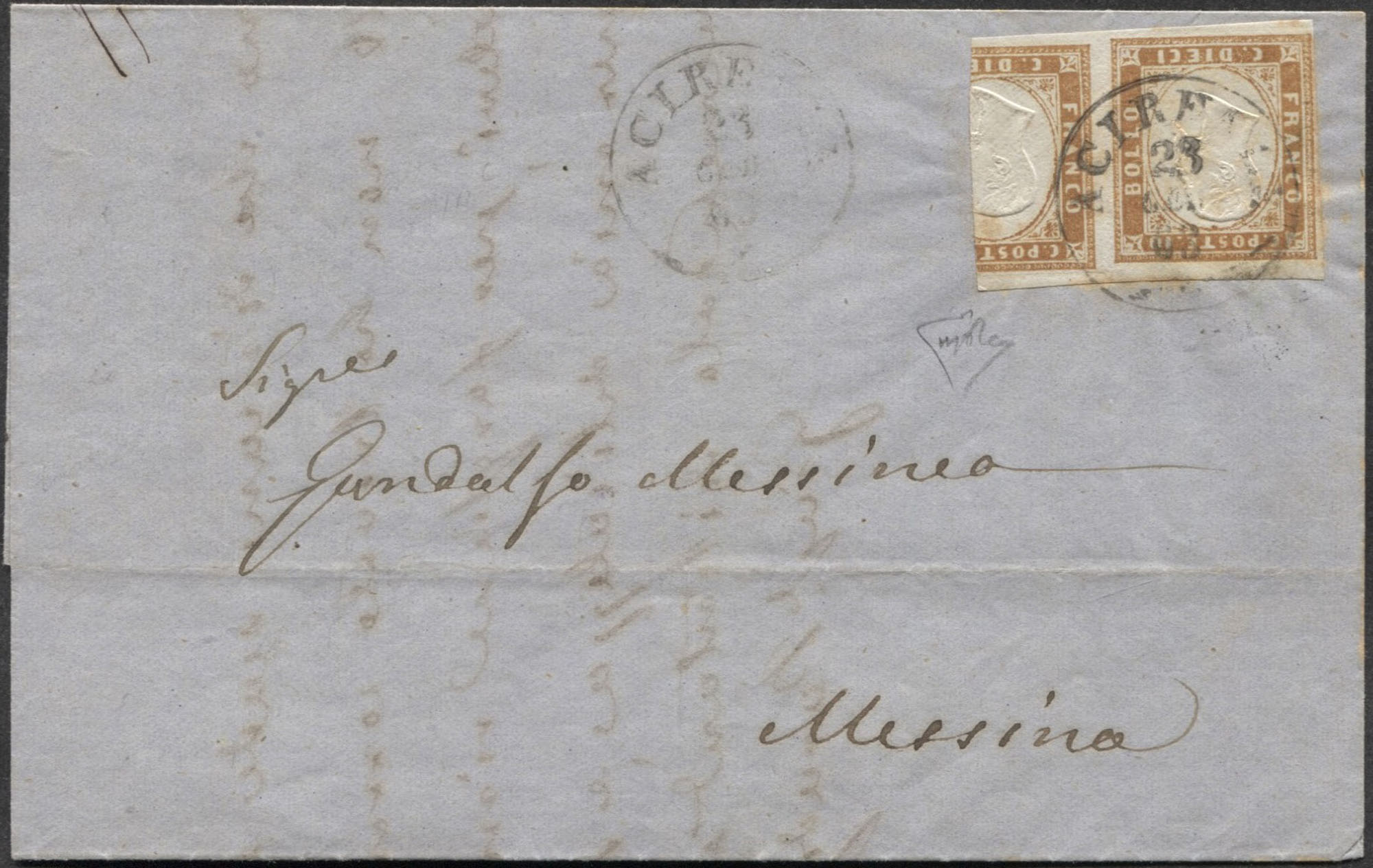 Antichi Stati Italiani - Sardegna - Lettera (14Dca)Lettera da Acireale 23.1.63 per Messina affrancata per la tariffa di 15 cent con coppia del 10 cent con es. di destra frazionato verticalmente - buoni margini - rarità - cert. ED - (14Dca)