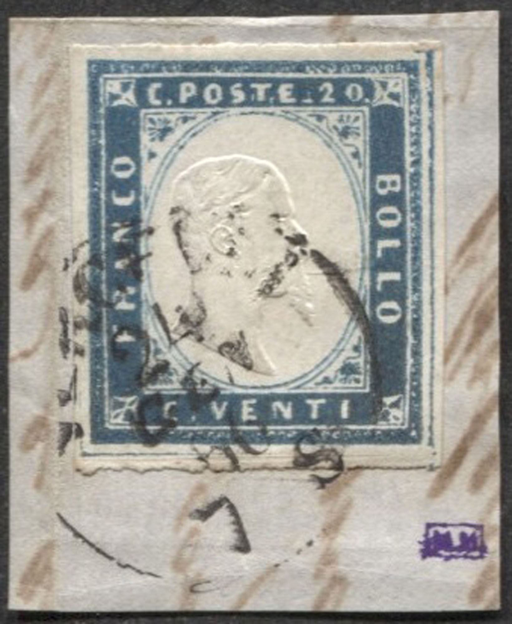 Antichi Stati Italiani - Sardegna - 20 cent (15d)Frammento con 20 cent cobalto latteo vivace - bene marginato - Casale - Bolaffi - (15d)