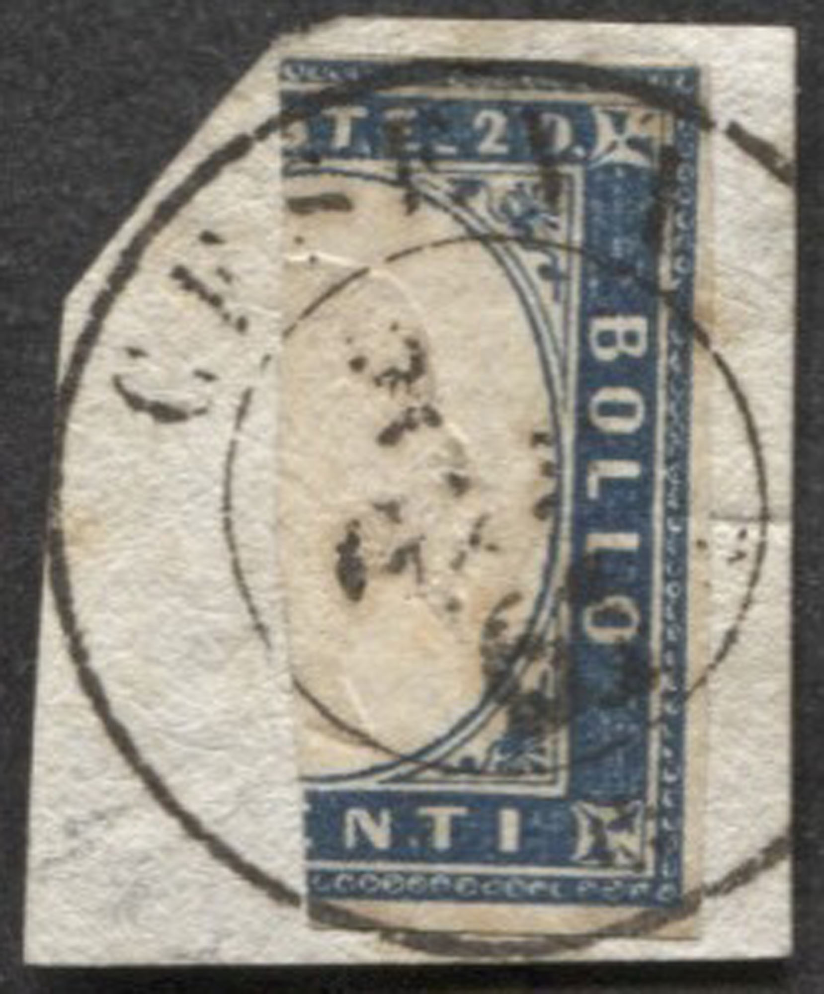 Antichi Stati Italiani - Sardegna - 20 cent (15Ca)Bel frammento recante la metà verticale bene marginata di un 20 cent azzurro - Cesena 2.6.61 in DC - RARO - cert. AD - (15Ca)