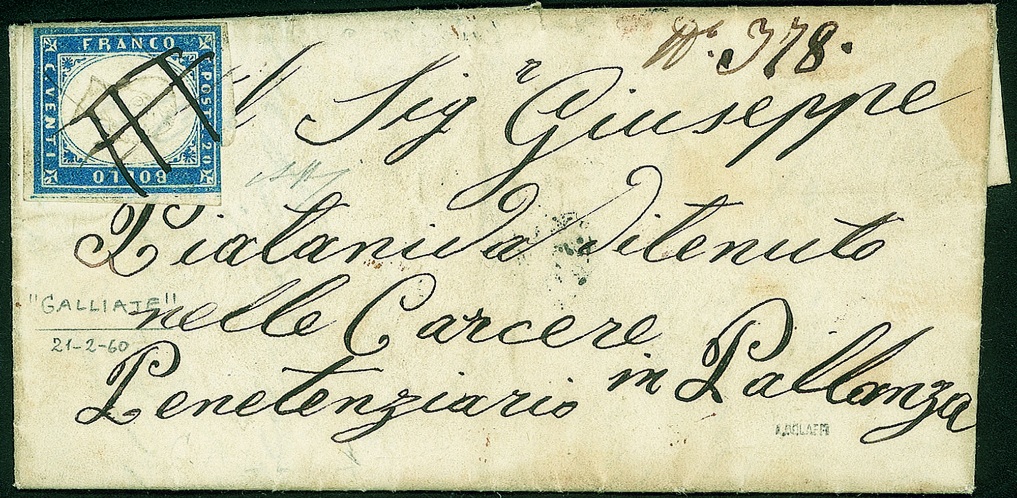 Antichi Stati Italiani - Sardegna - Letterina (15Ca)Letterina affrancata con 20 cent (15Ca) annullato con tratti a penna di Galliate del 21.2.1860 per Pallanza - unica nota - firme G. Bolaffi + A. Bolaffi