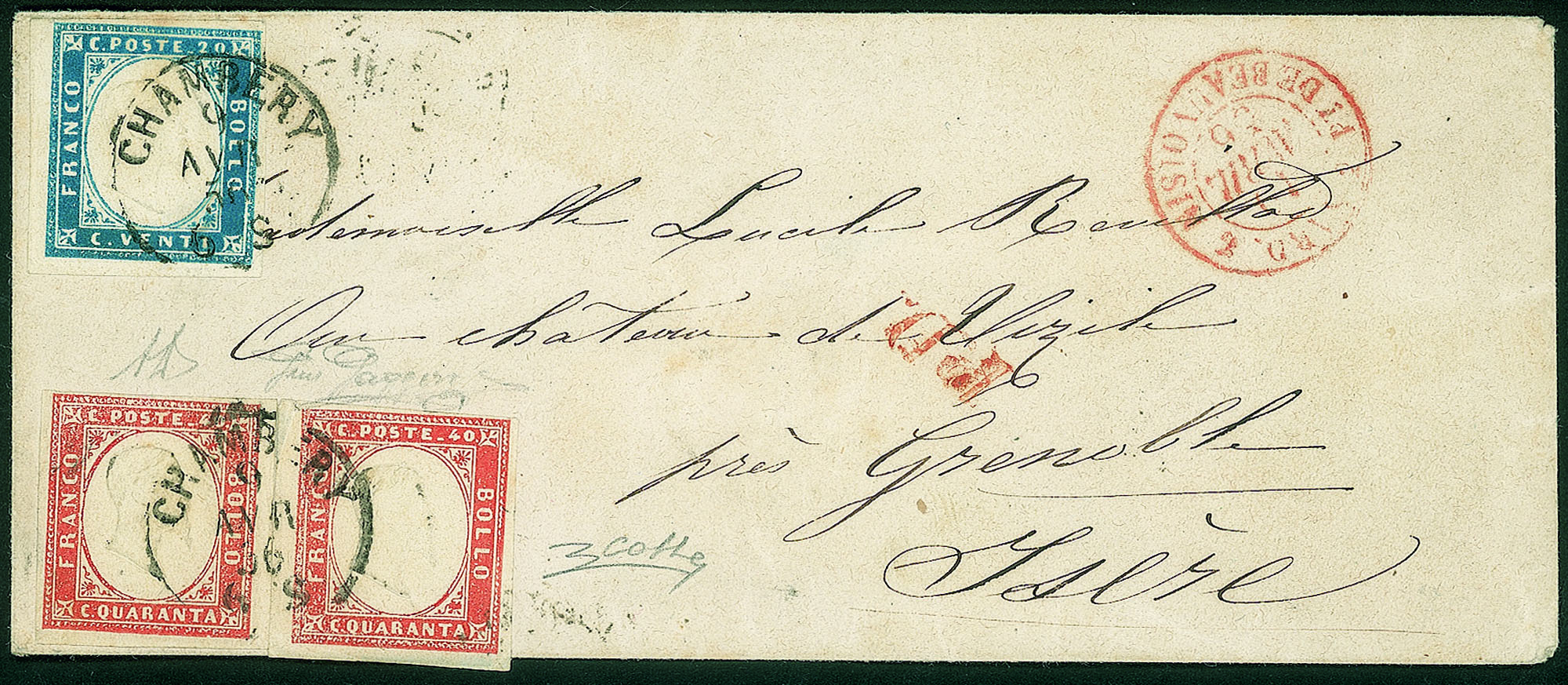 Antichi Stati Italiani - Sardegna - Annulli Savoia - 20 cent + due 40 cent (15f + 16)Lettera doppio porto per la Francia affrancata con 20 cent celeste + due esemplari del 40 cent vermiglio tenue (15f + 16) - tutti ben marginati - da Chambery 9 AVR.56 per Grenoble con P.D. in rosso e bollo d'ingresso Sard. 2 Pt De Beauvoisin 10 AVRIL 56 in rosso - cert. Colla