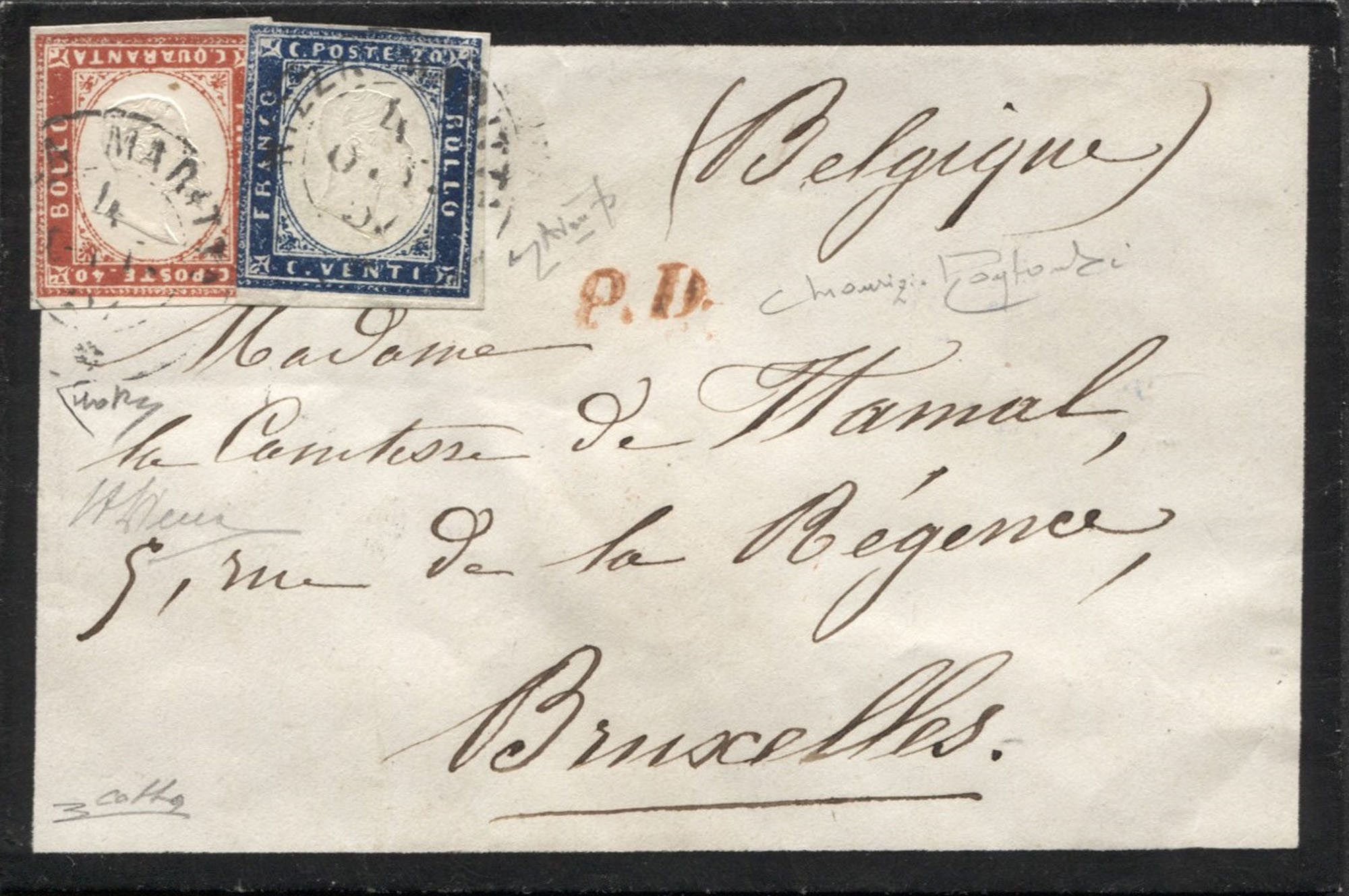 Antichi Stati Italiani - Sardegna - Bustina (16A + 15Aa)Bustina da Nizza Marittima 4.10.57 per Bruxelles affrancata con 40 effige capovolta più 20 cent - margini in ordine - UNICO CASO NOTO di questa gradazione di colore - AD + Raybaudi + cert. AD + cert. ED + cert. Avanzo - (16A + 15Aa)