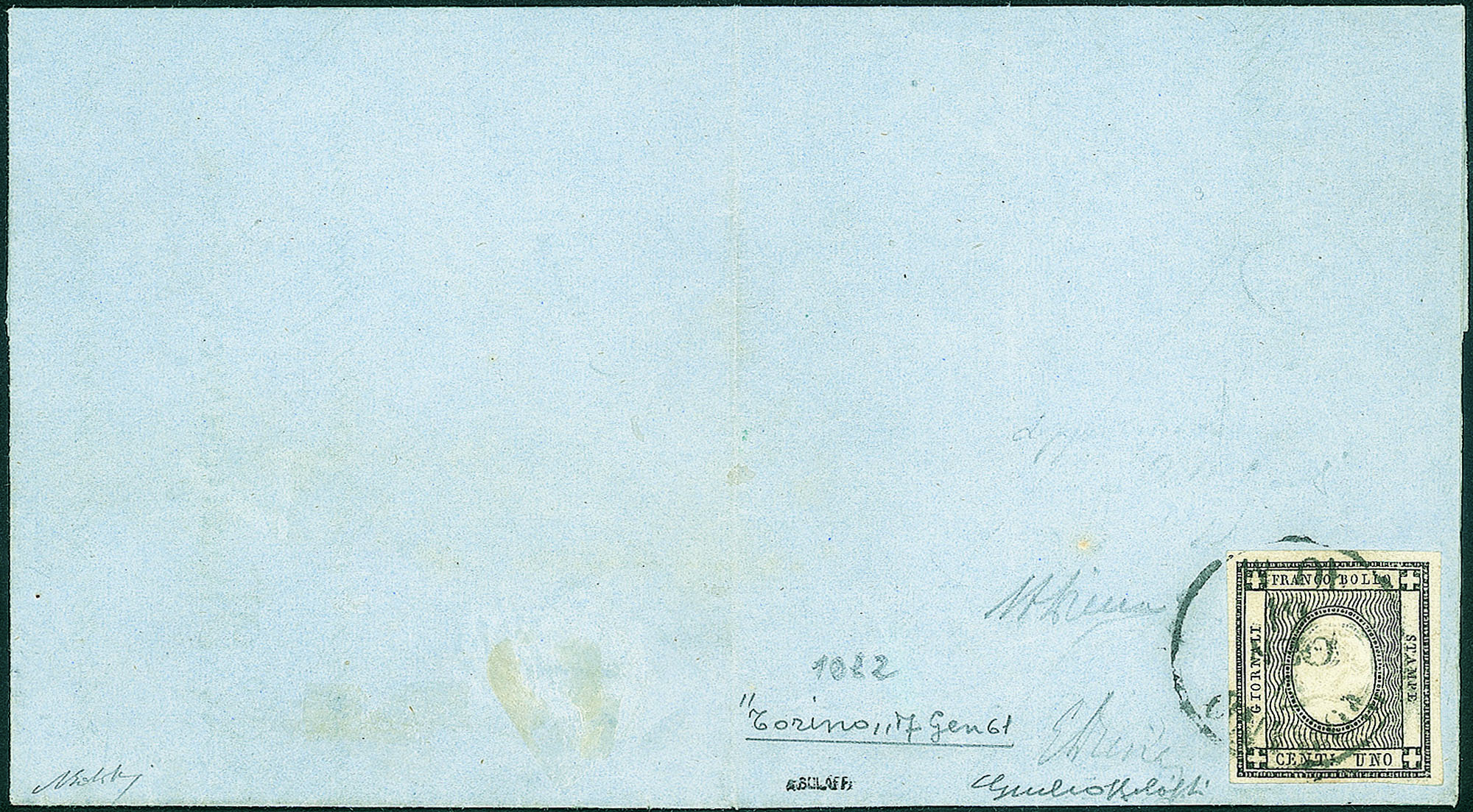 Antichi Stati Italiani - Sardegna - Circolare sotto fascia da Torino 7.1.61Affrancata con 1 cent (19l) errore cifra 2 - buoni margini - settimo giorno d'uso - firma Bolaffi + A. Diena + E. Diena