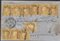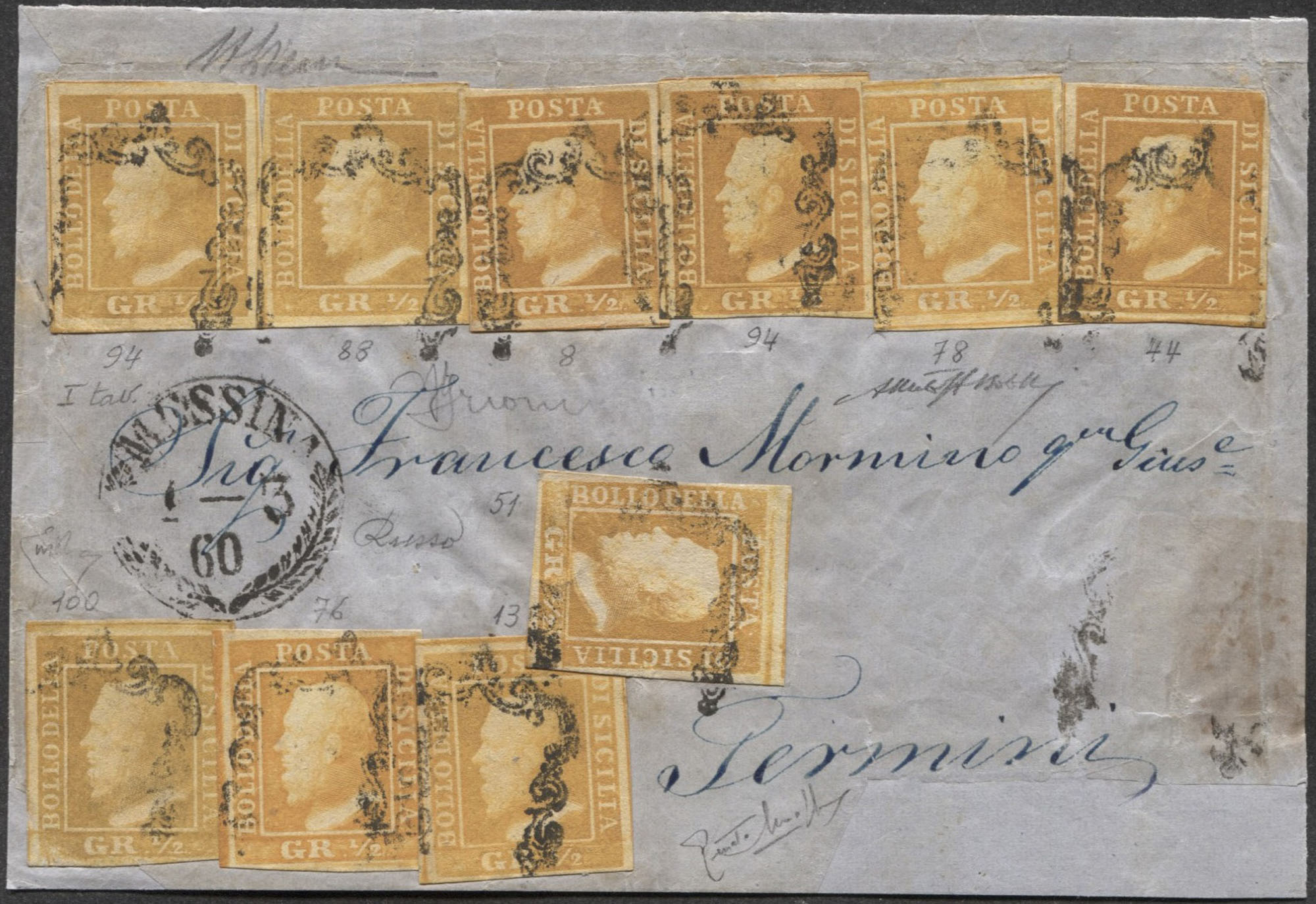 Antichi Stati Italiani - Sicilia - Lettera (1b + 1a + 1e)Lettera da Messina 1.3.60 per Termini recante dieci es. del 1/2 gr. Lettera da Messina 1.3.60 per Termini recante dieci es. del 1/2 gr. di cui da sinistra a destra il primo (pos. 94) il secondo (pos. 88) e il settimo (pos. 10) provengono da foglio di antica tiratura stampato in giallo oliva - altri tre (pos. 78 toccato - 13 - 51) sono di tinta giallo arancio - due (pos. 8 toccato - 44) in arancio scuro e due (pos. 94 - 76) in arancio - in origine vi erano altri due es. che sono stati levati in quanto piegati - SENSAZIONALE DOCUMENTO con quattro gradazioni di colore e con tre es. del giallo oliva su lettera - quinto posto nella scala delle rarità di Sicilia - Russo + Bolaffi + Mondolfo esteso + cert. AD + cert. ED - (1b + 1a + 1e)