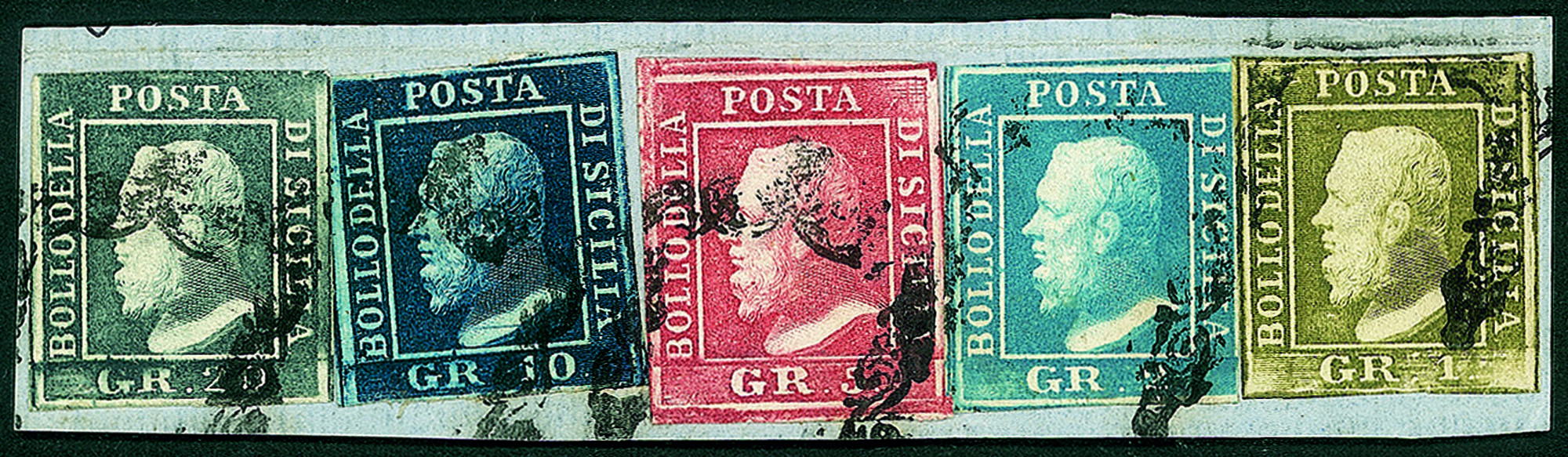 Antichi Stati Italiani - Sicilia - Frammento con affrancatura pentacolore (13 + 12b + 9 rit.46 + 8b + 4)Frammento con affrancatura pentacolore composta da 20 grana grigio ardesia + 10 grana indaco + 5 grana rosa carminio I tavola ritocco 46 + 2 grana azzurro verdastro III tavola + 1 grano oliva chiaro II tavola (13 + 12b + 9 rit.46 + 8b + 4) con margini da buoni a ottimi - cert. Alberto Diena