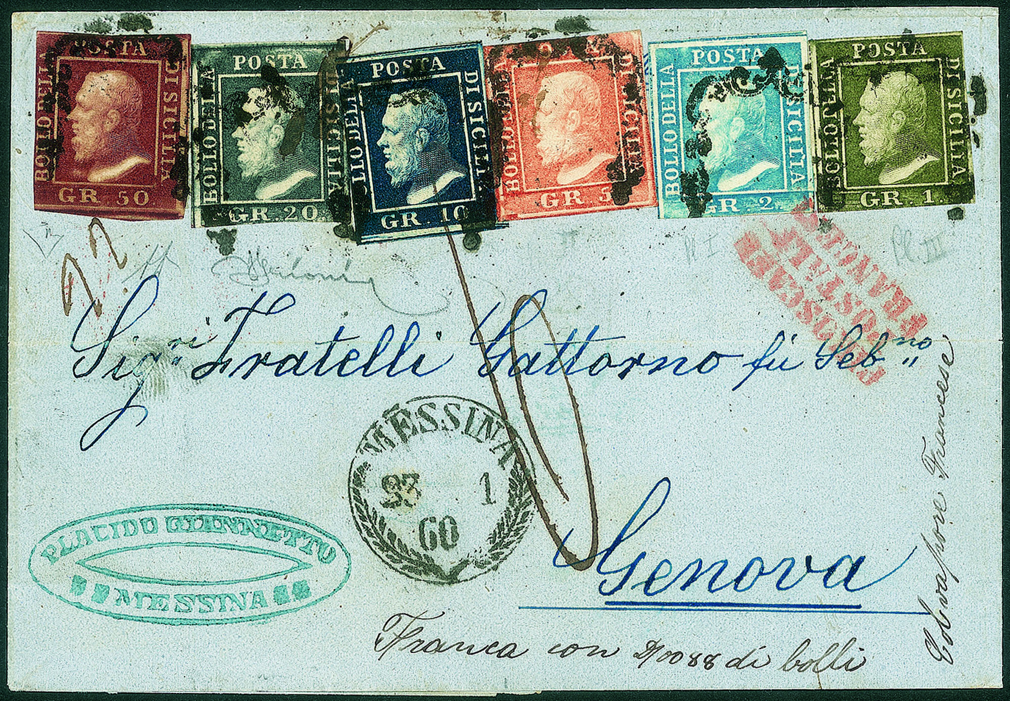 Antichi Stati Italiani - Sicilia - Lettera (5d + 8d + 10 + 13c + 14 cat.274850)Eccezionale lettera in affrancatura esacolore da Messina 23-1 60 per Genova con i 'Piroscafi postali francesi' affrancata con 1 grano verde oliva III tavola carta di Palermo + 2 grana azzurro III tavola carta di Palermo + 5 grana vermiglio chiaro I tavola + 10 grana indaco + 20 grana ardesia scuro + 50 grana lacca bruno (5d + 8d + 10 + 13c + 14 cat.274850) - cert. Enzo Diena