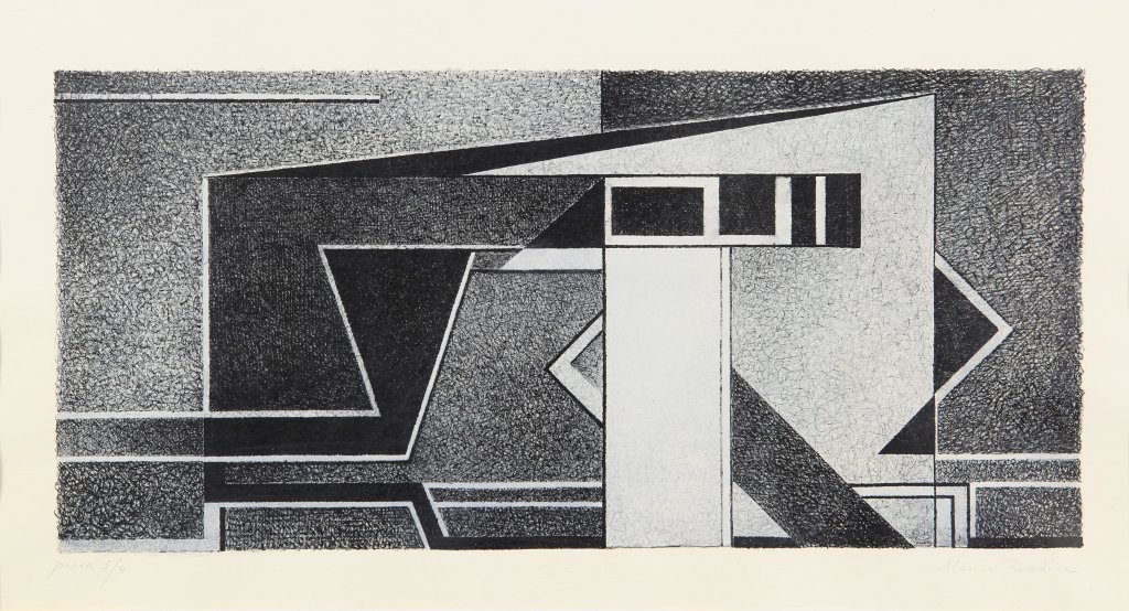 MARIO RADICE (1900 - 1987) Composizione GRU litografia bianco-nero cm 28,5x53 esemplare prova 3/4 firmato in basso a destra, numerato in basso a sinistra sul retro: etichetta Galleria Martano, Torino; timbro Galleria d'Arte Unimedia, Genova Composizione GRU lithography white - black 11,23x20,88 in proof edition 3/4 signed lower right numbered lower left on the reverse: label of Martano Gallery, Torino; stamp of Unimedia Art Gallery, Genova
