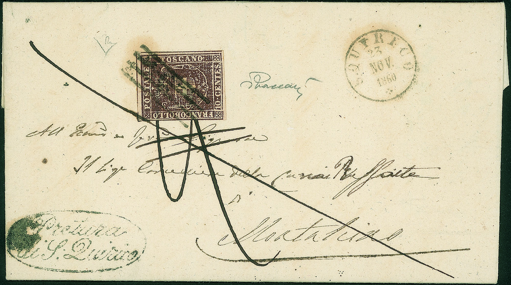 Antichi Stati Italiani - Toscana - Governo Provvisorio - S. Quirico (doppio cerchio) + muto a 4 sbarre (P.ti R1) su 10 cent (19)Lettera per Montalcino del 23.11.60 non affrancata in partenza e quindi tassata ma poi detassata dopo la regolare affrancatura - Vaccari + cert. Diena