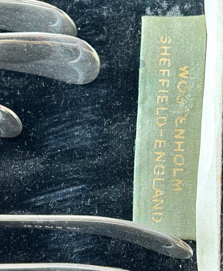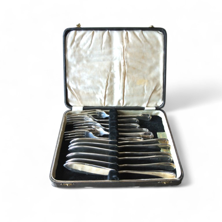 Astuccio con sei forchette e sei coltelli da pesce in metallo argentato