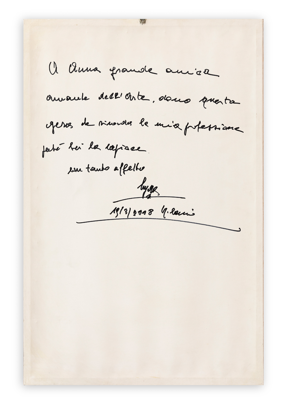 Firma e dedica ad personam della sorella Lyda Bianchi al retro del cartoncino protettivo