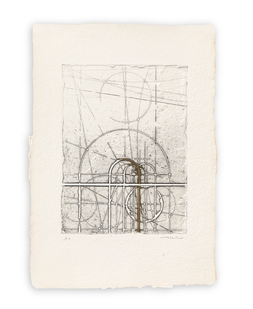 Cartella contenente una lirica in sei lingue di Giacomo Oreglia e una acquaforte di Walter Valentini recante firma e numerazione (Esemplare p.a.) a matita al fronte e timbro a secco dello Stampatore