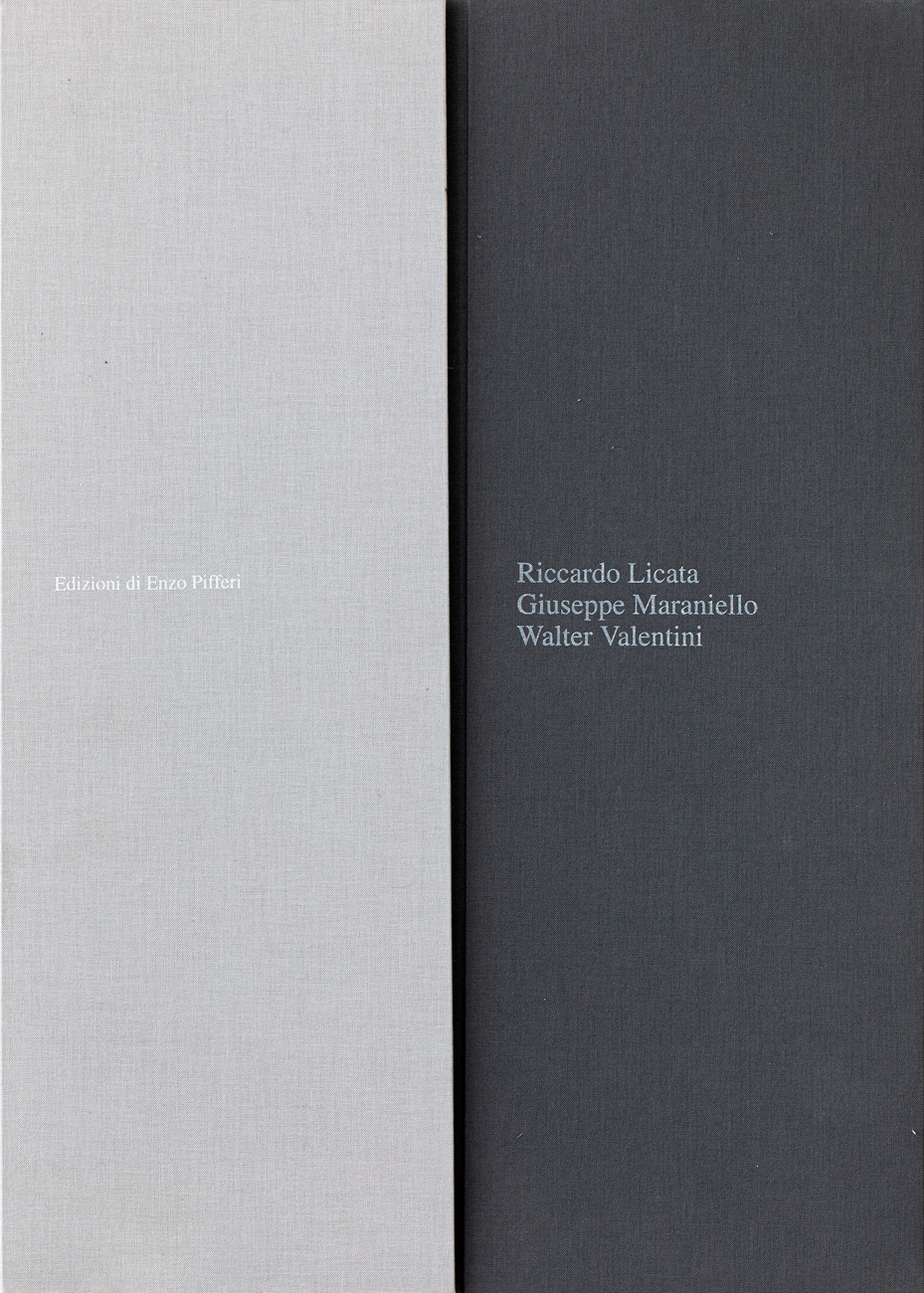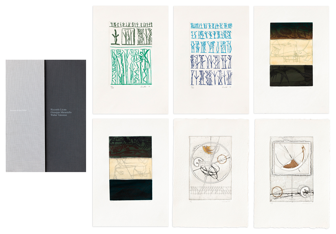 Cartella contenente 2 acqueforti di Riccardo Licata, 2 acqueforti di Giuseppe Maraniello e 2 acqueforti di Walter Valentini, ciascuna recante firma e numerazione (Esemplari VII/IX) a matita al fronte e timbro a secco dello Stampatore