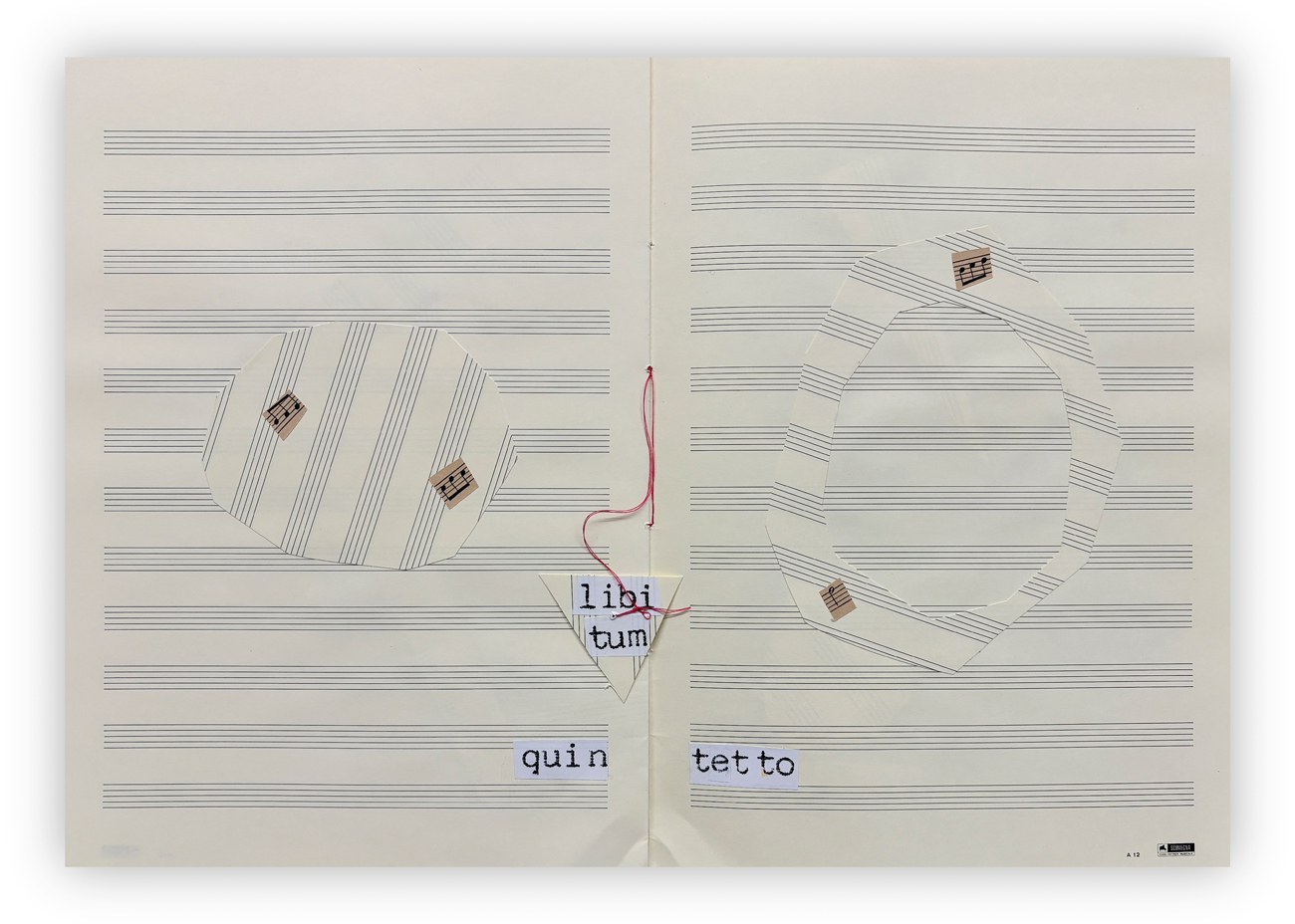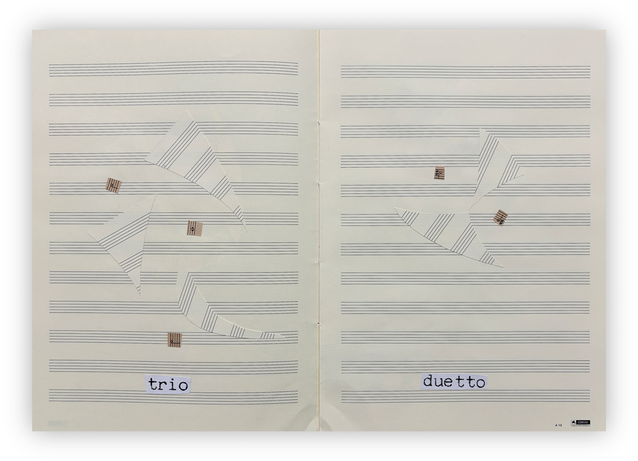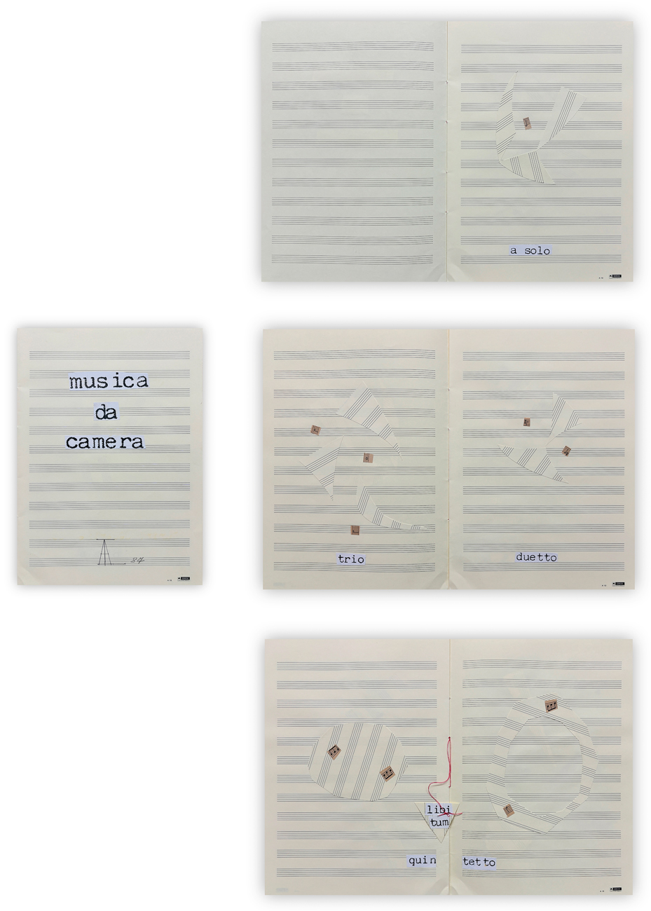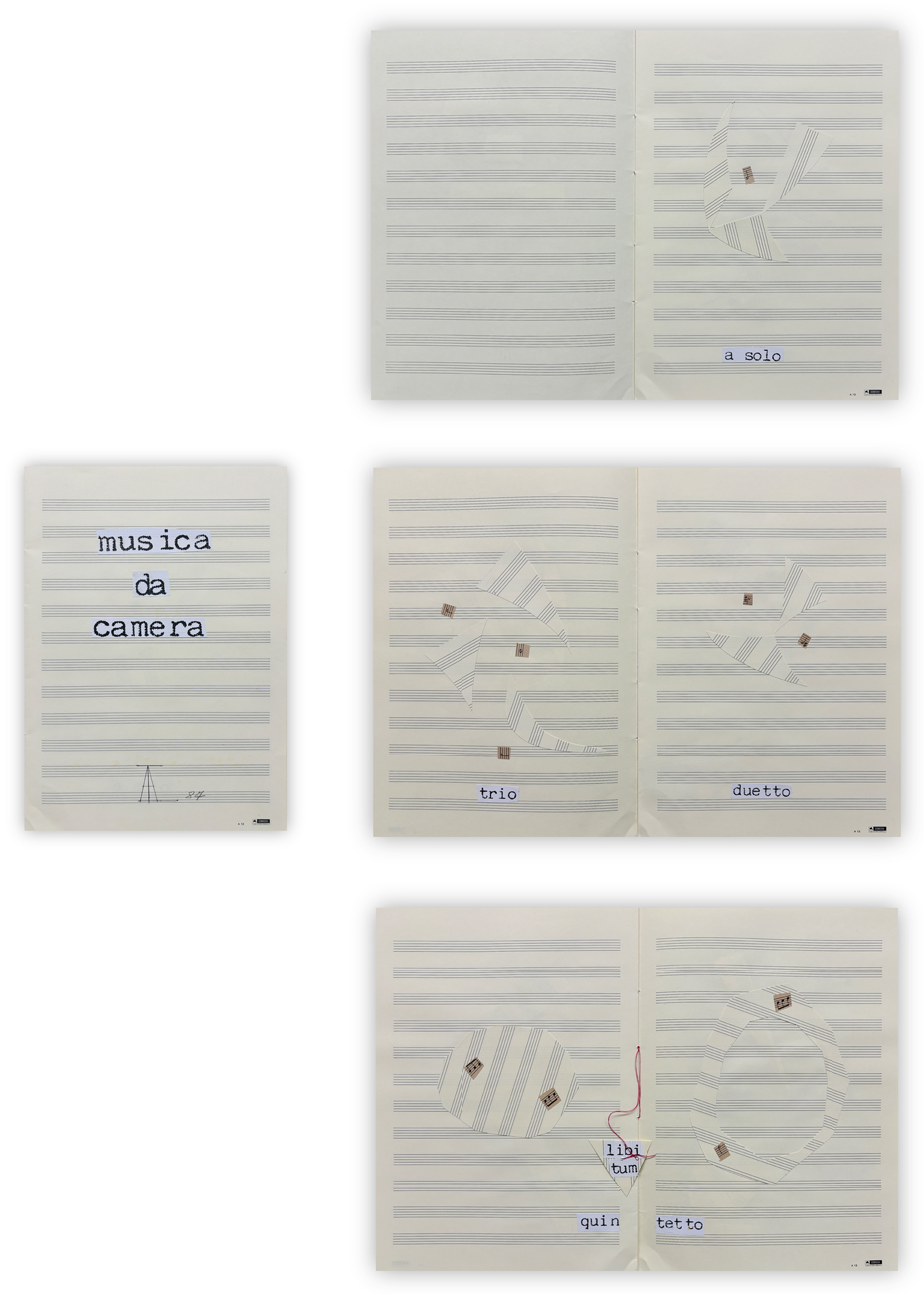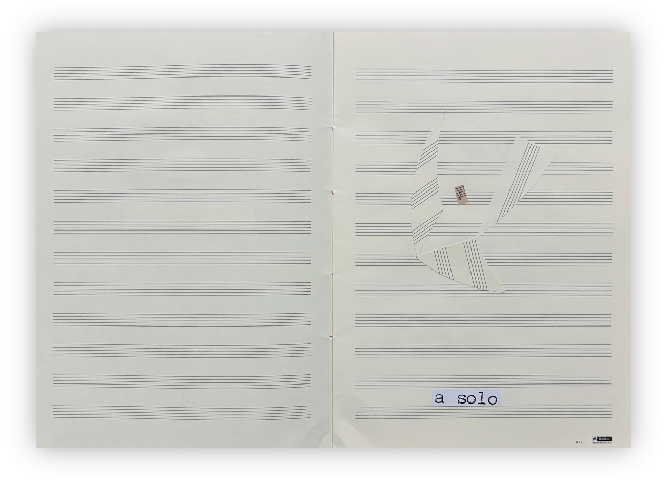 Splendido quaderno, con rilegatura in filo, composto da 12 pagine pentagrammate interamente lavorate a tecnica mista e collage di carte ritagliate, sagomate, sovrapposte e con intervento in filo