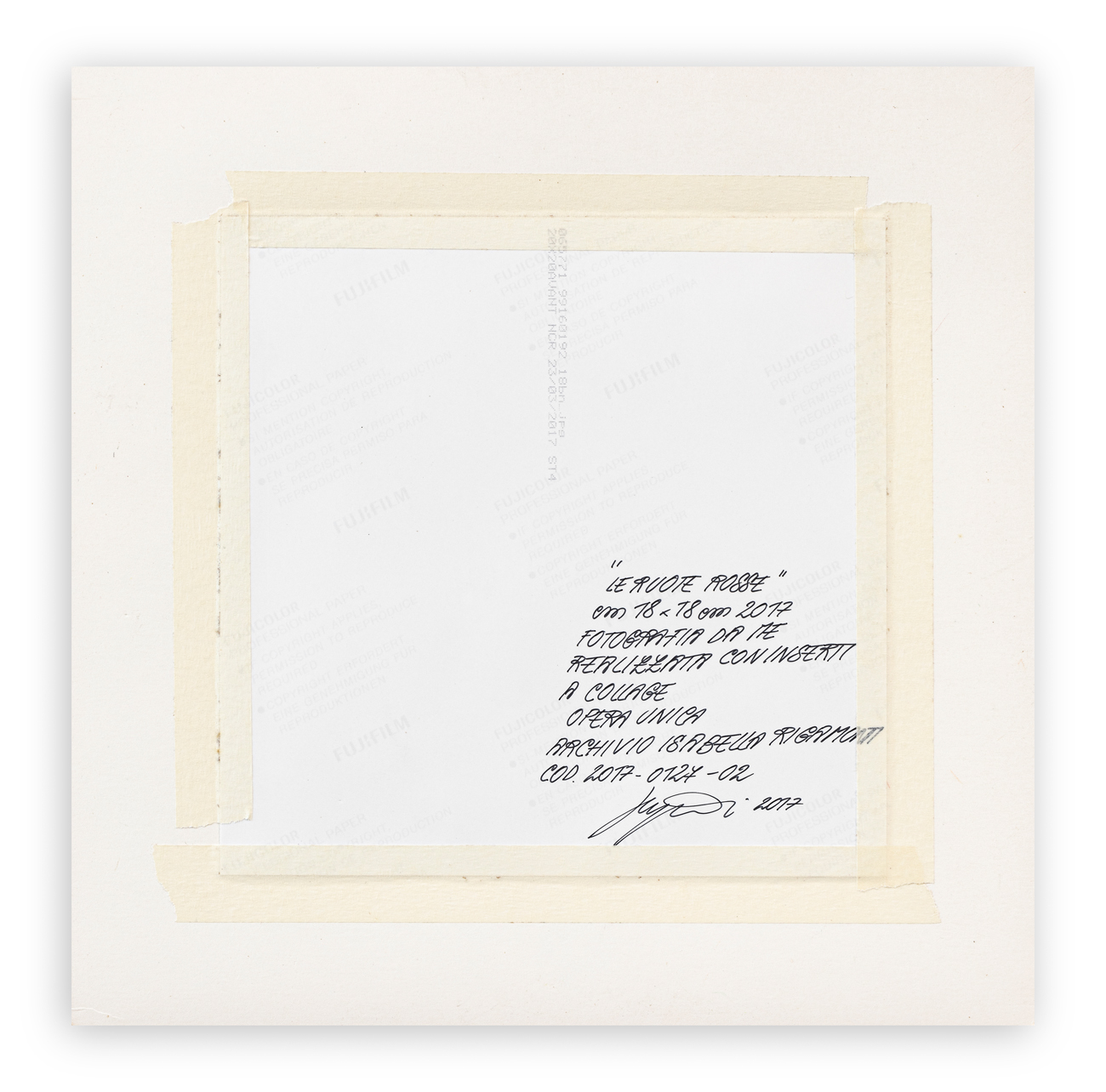 Firma, titolo, datazione, tecnica, misure e iscrizione "opera unica al retro