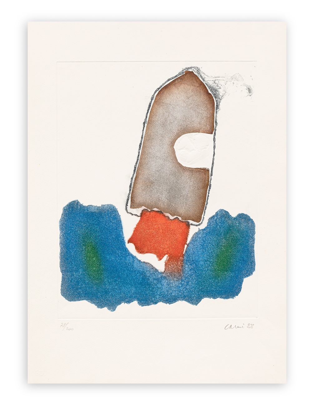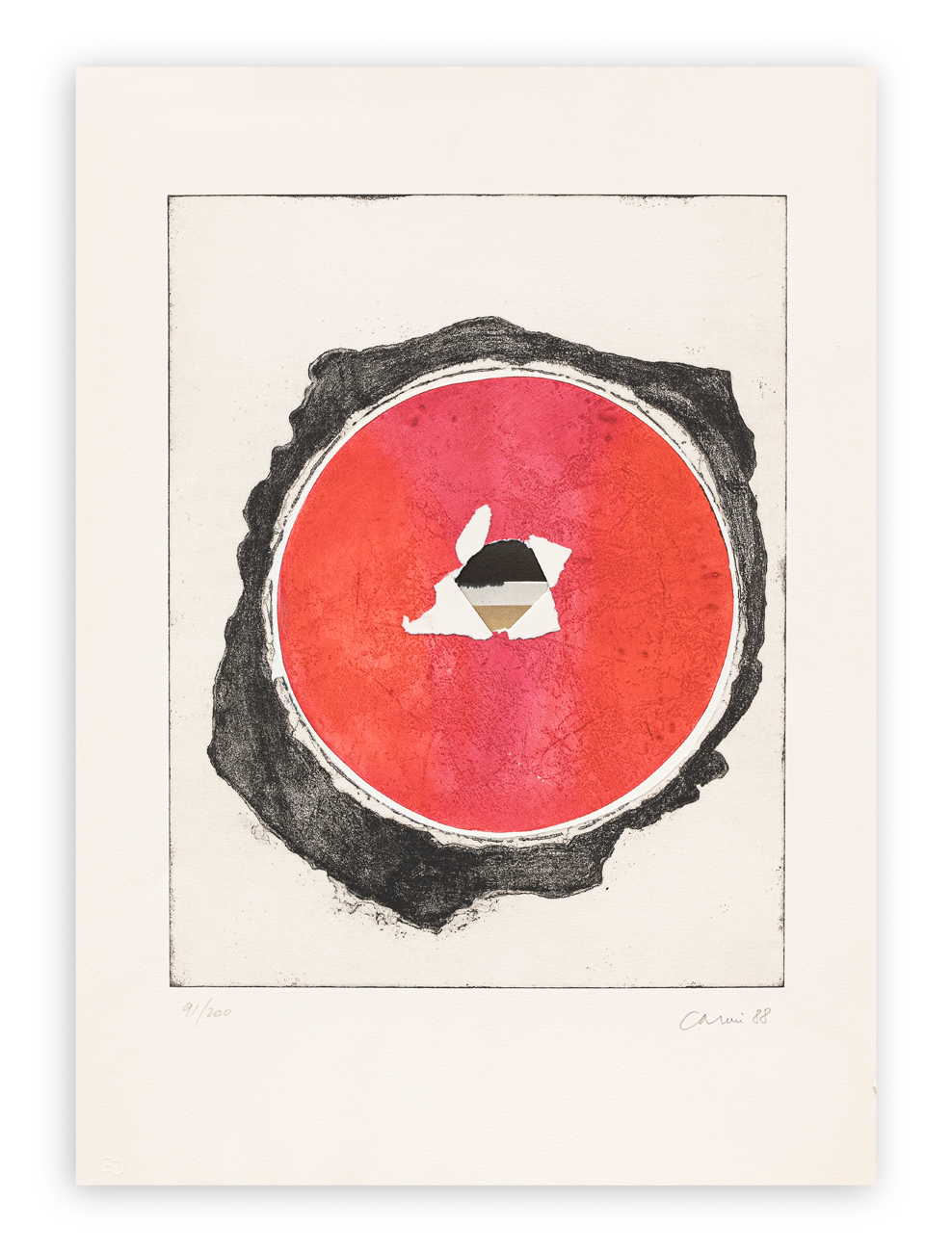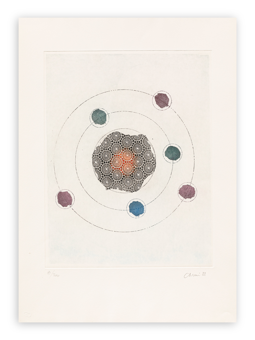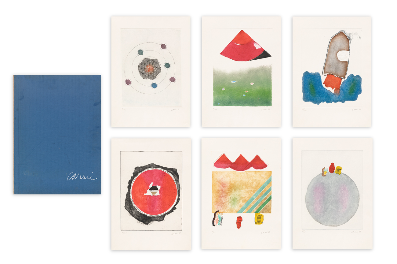 Cartella contenente 6 acqueforti acquetinte con interventi in calcografia a colori, frottages, collages e argento 900/1000 su carta Arches 300 gr/mq, ciascuna recante firma, datazione e numerazione (Esemplari 78/200) a matita al fronte