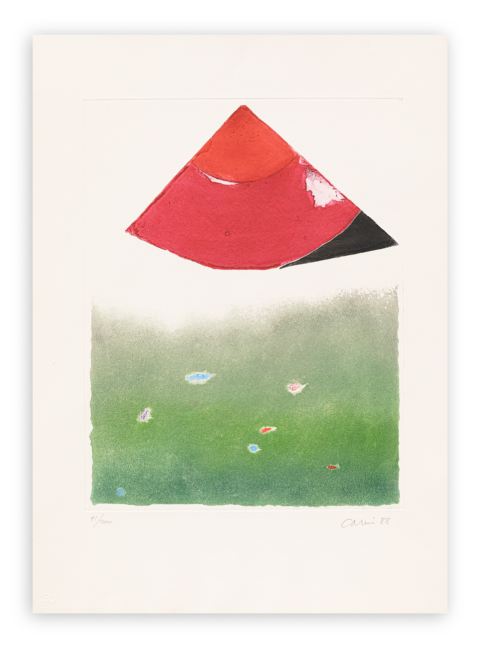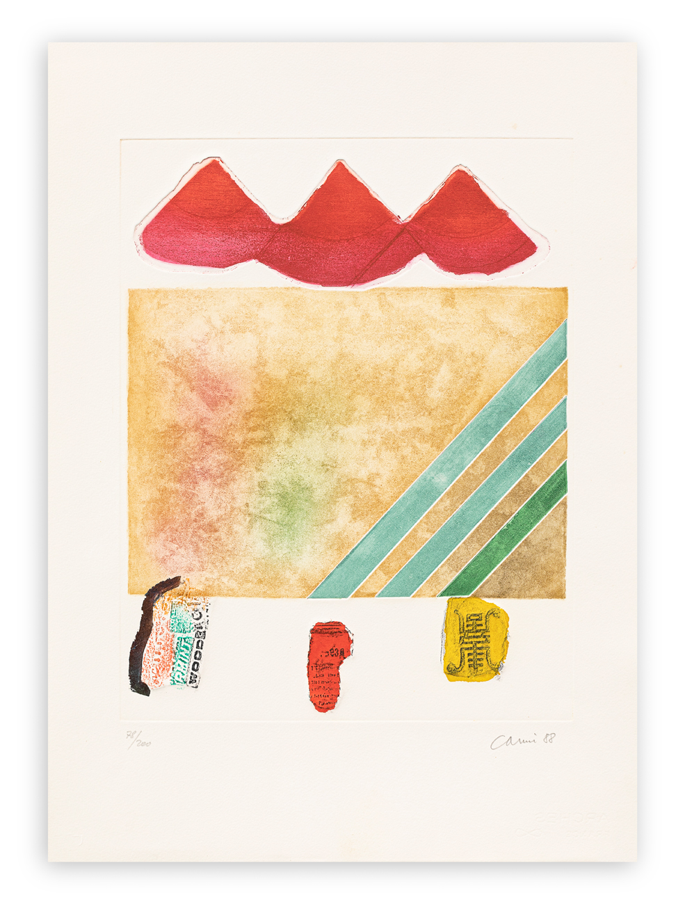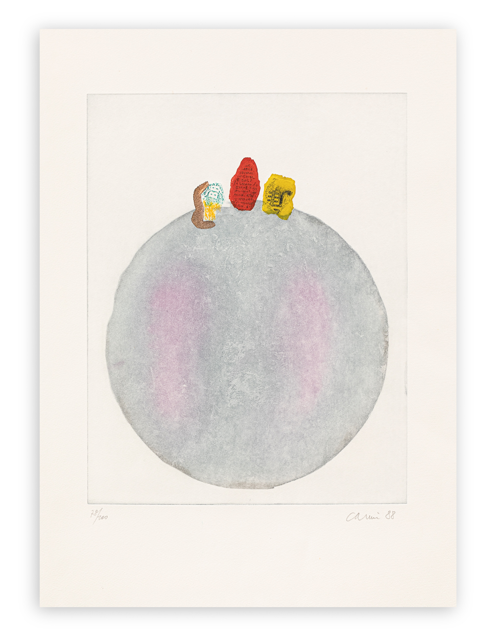 Cartella contenente 6 acqueforti acquetinte con interventi in calcografia a colori, frottages, collages e argento 900/1000 su carta Arches 300 gr/mq, ciascuna recante firma, datazione e numerazione (Esemplari 78/200) a matita al fronte