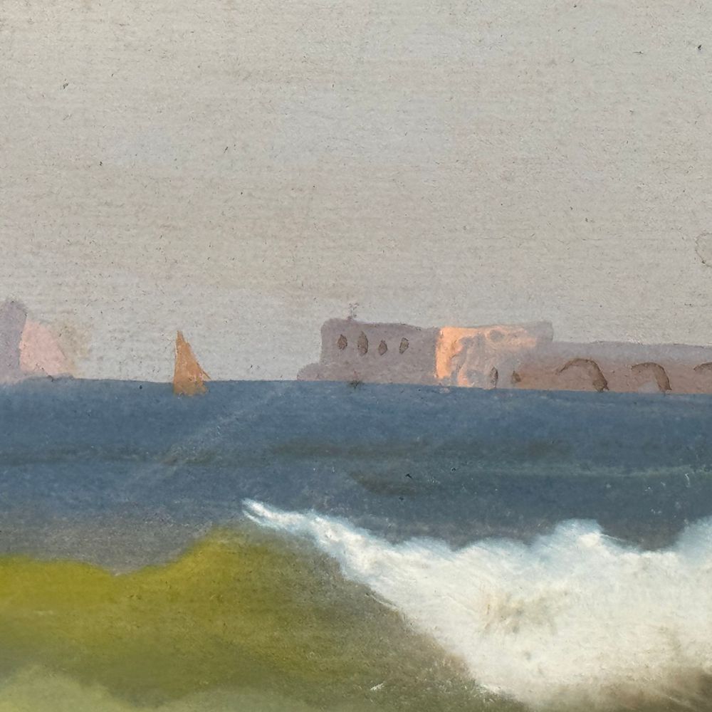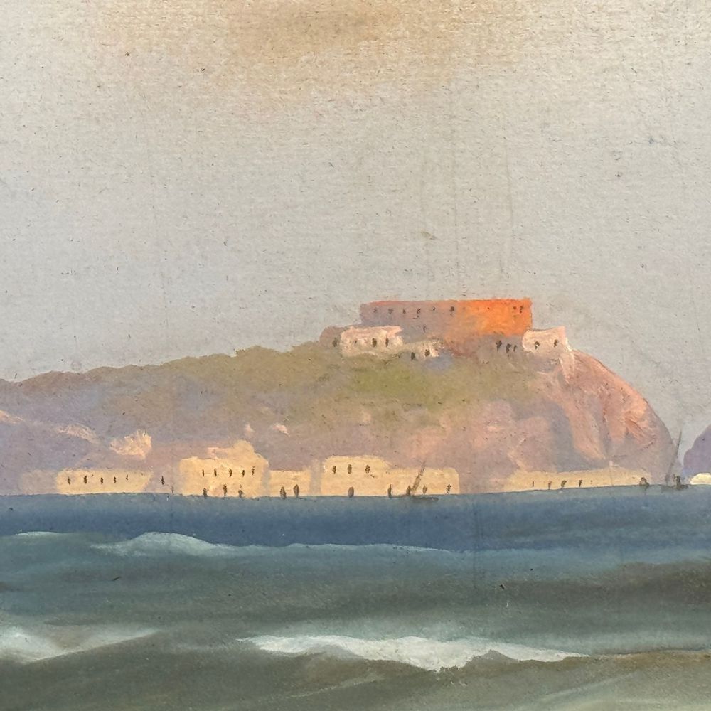 Dipinto guazzo (tempera su carta), periodo XIX secolo scuola Italiana, raffigurante Ischia e Procida dal mare. Dimensioni interno cornice: 44x23 cm. Dimensioni compreso cornice: 52x30 cm. Reca firma in basso a sinistra da Antonio Coppola. Opera in buone condizioni. Antonio Coppola, pittore napoletano, nato il 21 gennaio 1839, studiò all'Istituto di Belle Arti di Napoli, ove fu più volte premiato. Dipinge a tempera e ad olio, ed è specialista nel paesaggio. Dimorò in Atene circa due anni, e colà eseguì due grandi soffitti di un palazzo principesco. Fu quindi a Bari, ove eseguì diversi ritratti e ritornato a Napoli, lavorò indefessamente, esponendo in molte occasioni pregevoli lavori. Lavori degni di nota sono pure le sue pergamene all'acquerello, che egli tratta con fina ed accurata maestria.