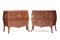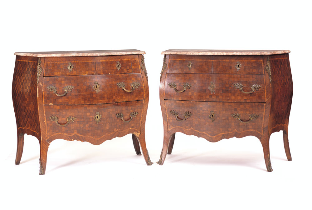 COPPIA DI CASSETTONI INTARSIATI A MARQUETERIE, XIX SECOLO, in stile settecentesco con fronte e fianchi mossi, piani in marmo rosa, decori geometrici entro riserve e applicazioni in bronzo; usure, mancanze e sbeccature.