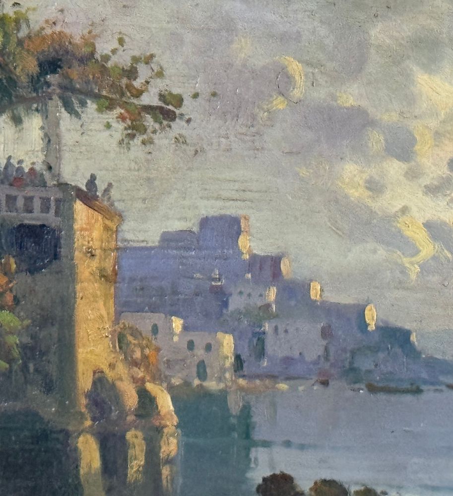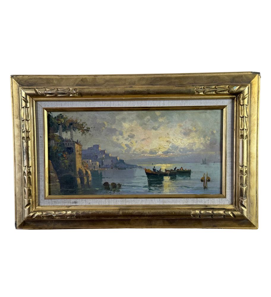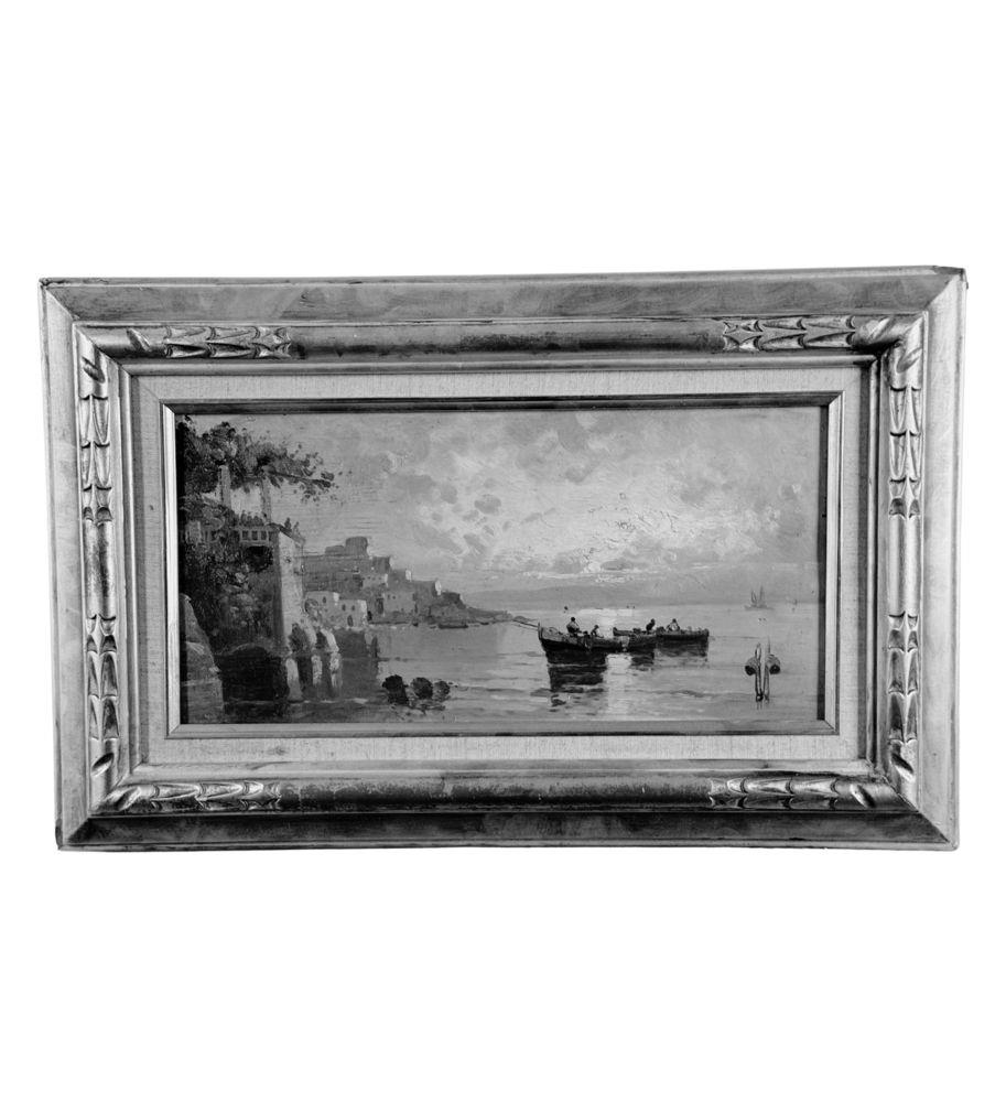 Dipinto olio su tavola, periodo XX secolo scuola Italiana, raffigurante Scorcio di marina napoletana nella maniera di De Corsi. Dimensioni compreso cornice: 55x35 cm. Dimensioni interno cornice: 39x20 cm. Da artista anonimo. Opera in buone condizioni.