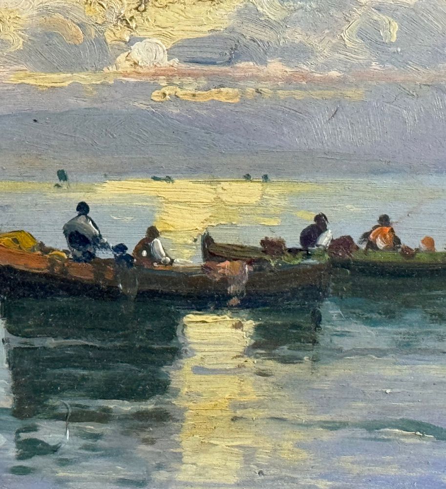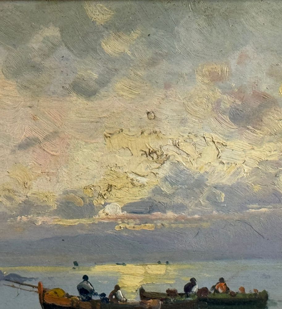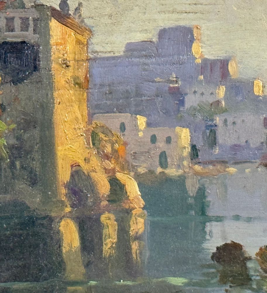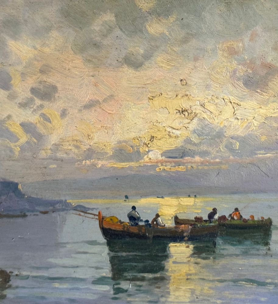 Dipinto olio su tavola, periodo XX secolo scuola Italiana, raffigurante Scorcio di marina napoletana nella maniera di De Corsi. Dimensioni compreso cornice: 55x35 cm. Dimensioni interno cornice: 39x20 cm. Da artista anonimo. Opera in buone condizioni.