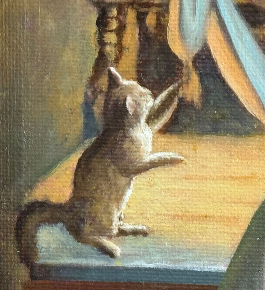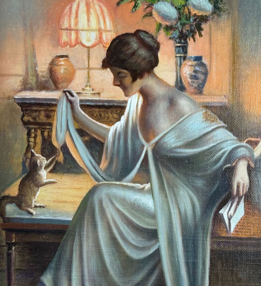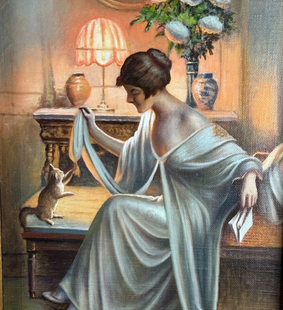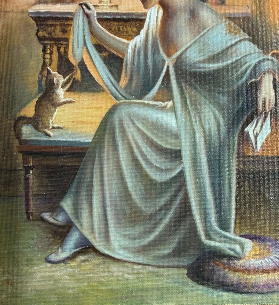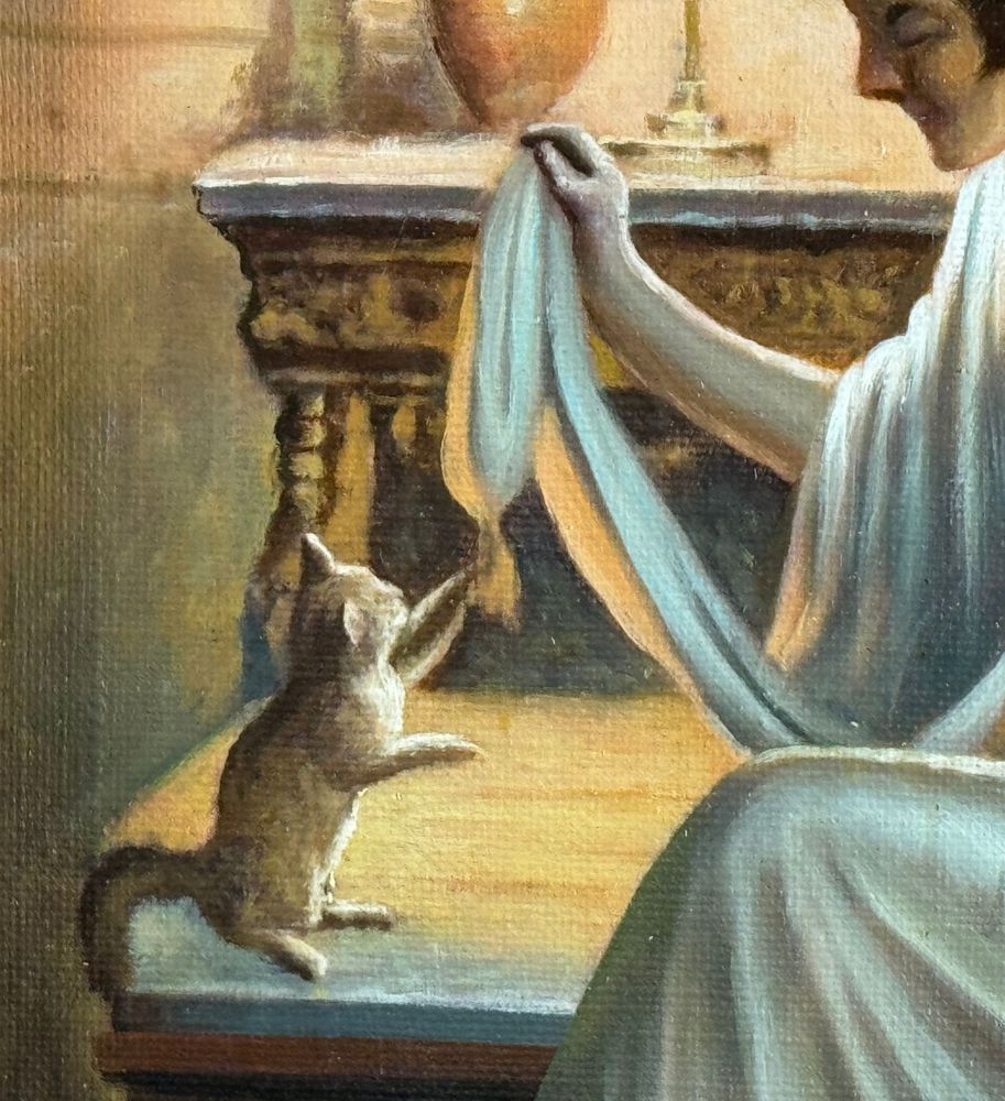 Dipinto olio su tela applicata su pannello, periodo XX secolo scuola italiana, raffigurante Giovane donna mentre gioca con il gatto. Copia da Delphin Enjolras (1857 - 1945) Dimensioni compreso cornice: 60x83 cm. Dimensioni interno cornice: 42x74 cm. Da artista anonimo. Opera in buone condizioni.