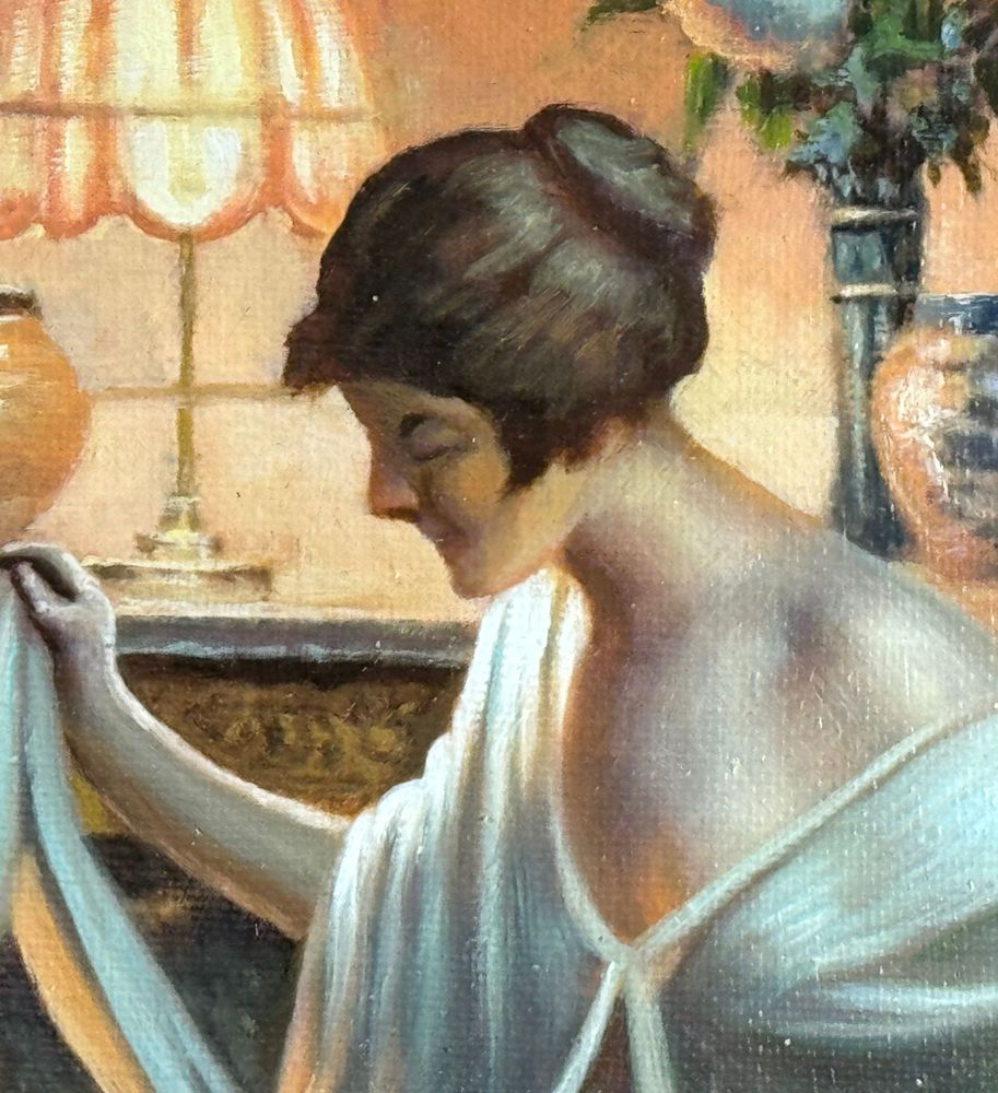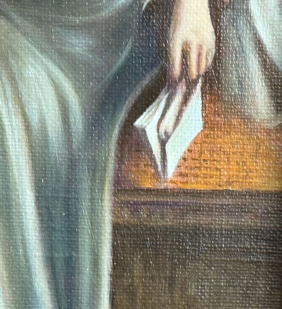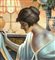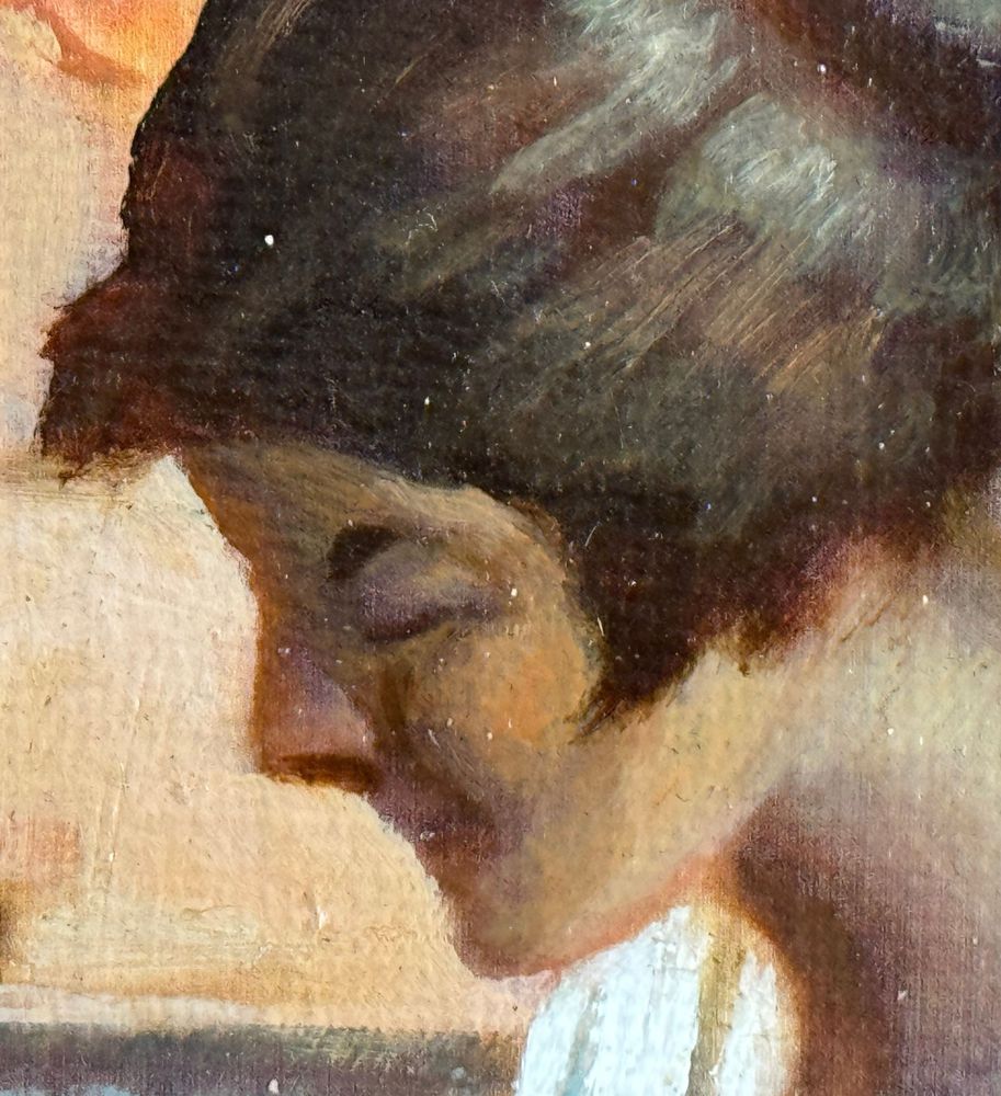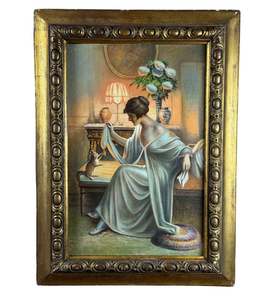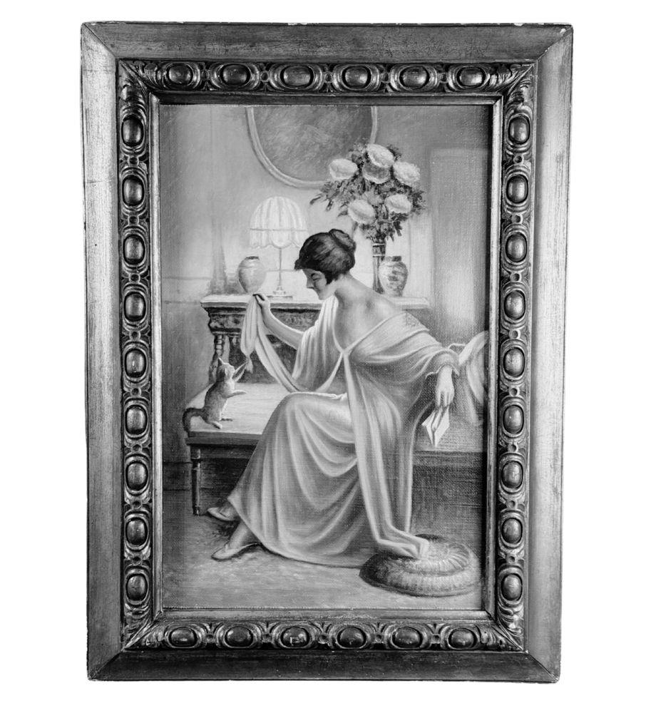 Dipinto olio su tela applicata su pannello, periodo XX secolo scuola italiana, raffigurante Giovane donna mentre gioca con il gatto. Copia da Delphin Enjolras (1857 - 1945) Dimensioni compreso cornice: 60x83 cm. Dimensioni interno cornice: 42x74 cm. Da artista anonimo. Opera in buone condizioni.