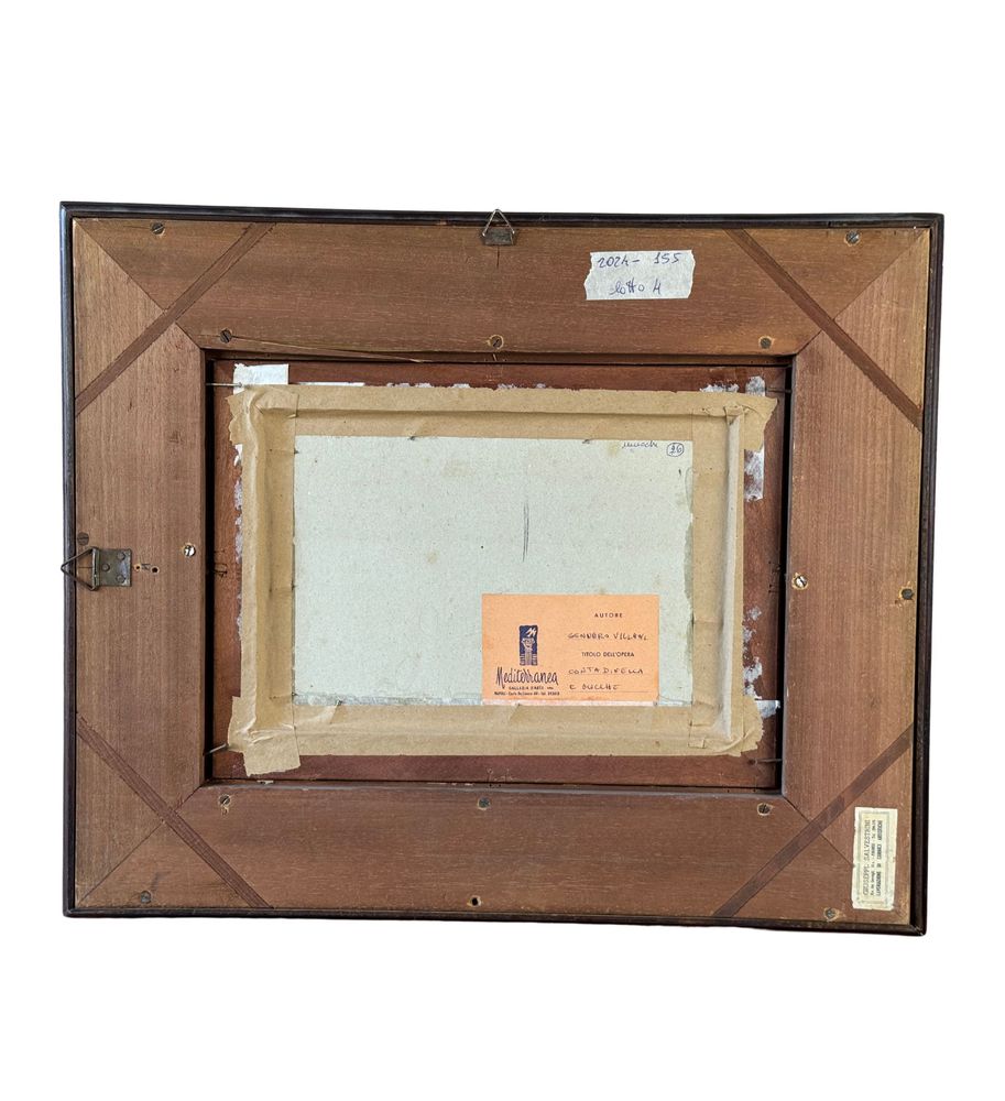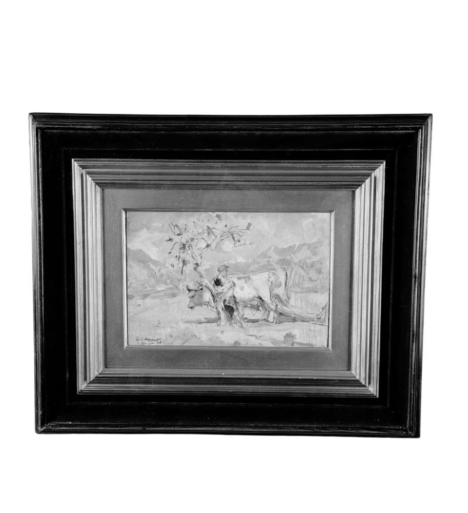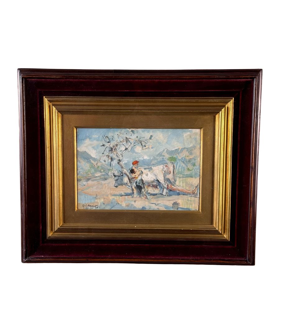 Dipinto olio su cartoncino, periodo XX secolo scuola Italiana, raffigurante Contadinella e mucche. Dimensioni compreso cornice: 48x40 cm. Dimensioni interno cornice: 26x18 cm. Reca firma in basso a sinistra da Gennaro Villani (Napoli, 1885 – 1948). Opera in buone condizioni.