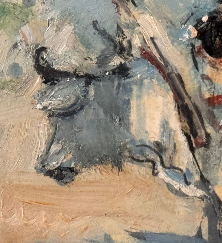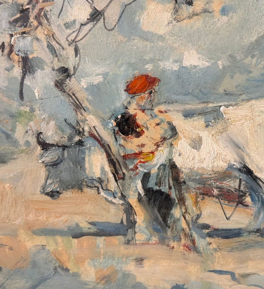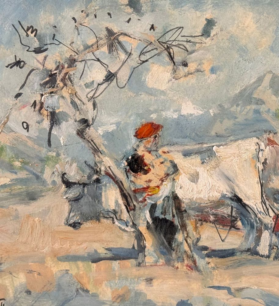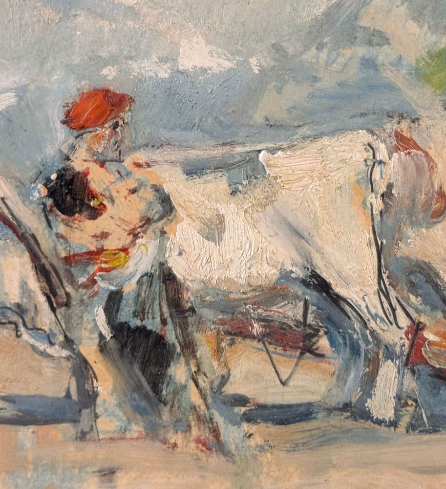 Dipinto olio su cartoncino, periodo XX secolo scuola Italiana, raffigurante Contadinella e mucche. Dimensioni compreso cornice: 48x40 cm. Dimensioni interno cornice: 26x18 cm. Reca firma in basso a sinistra da Gennaro Villani (Napoli, 1885 – 1948). Opera in buone condizioni.