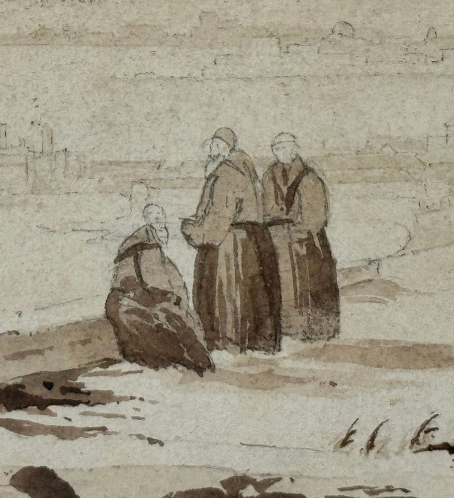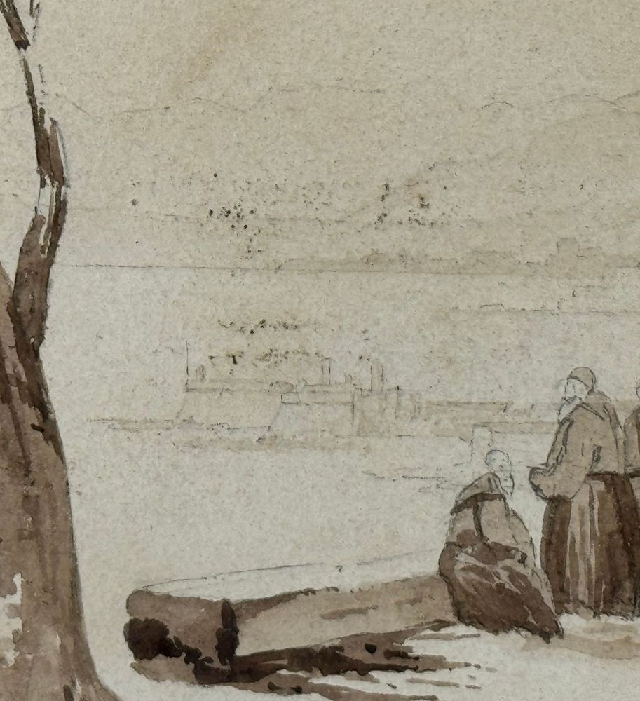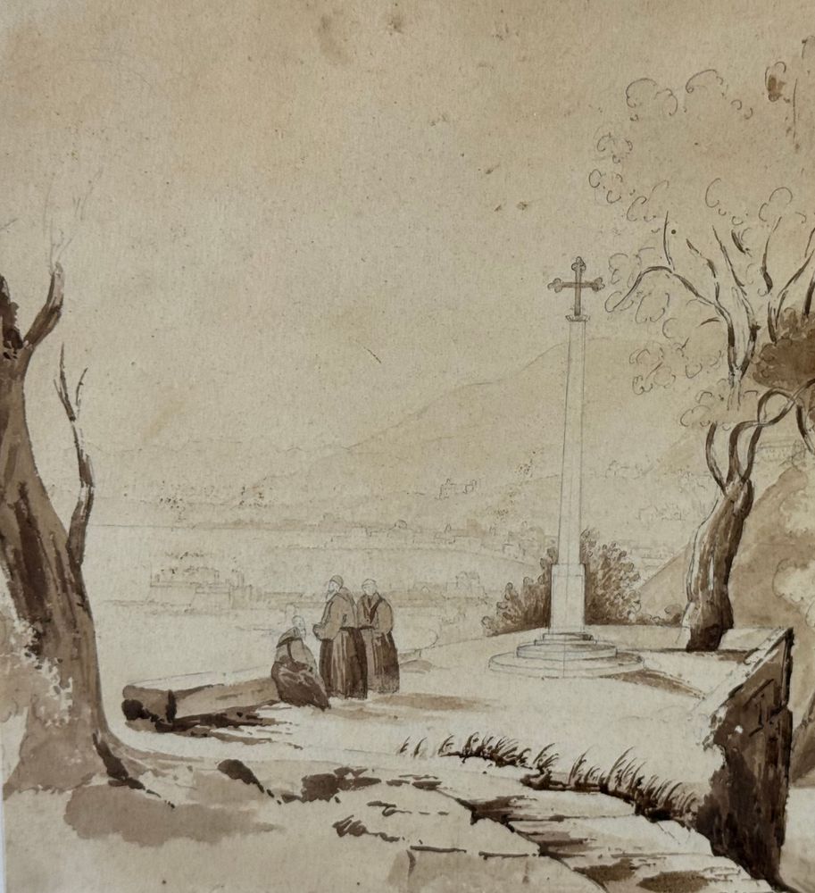 Acquerello su carta, periodo XIX secolo scuola Italiana, raffigurante Convento su golfo. Dimensioni compreso cornice: 28,5x30,5 cm. Dimensioni interno cornice: 18x20 cm. Attribuito a Gigante Giacinto (1806-1876). Opera in buone condizioni.