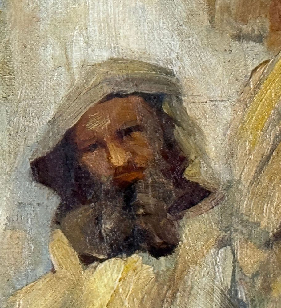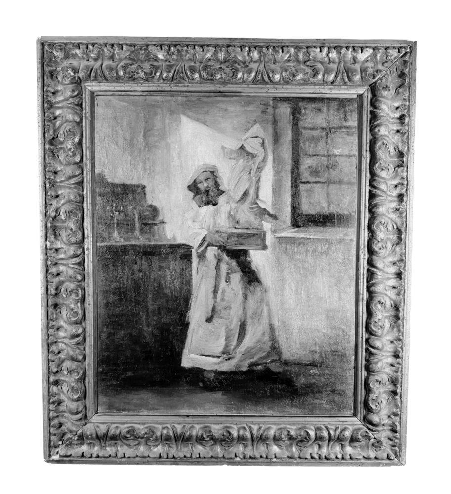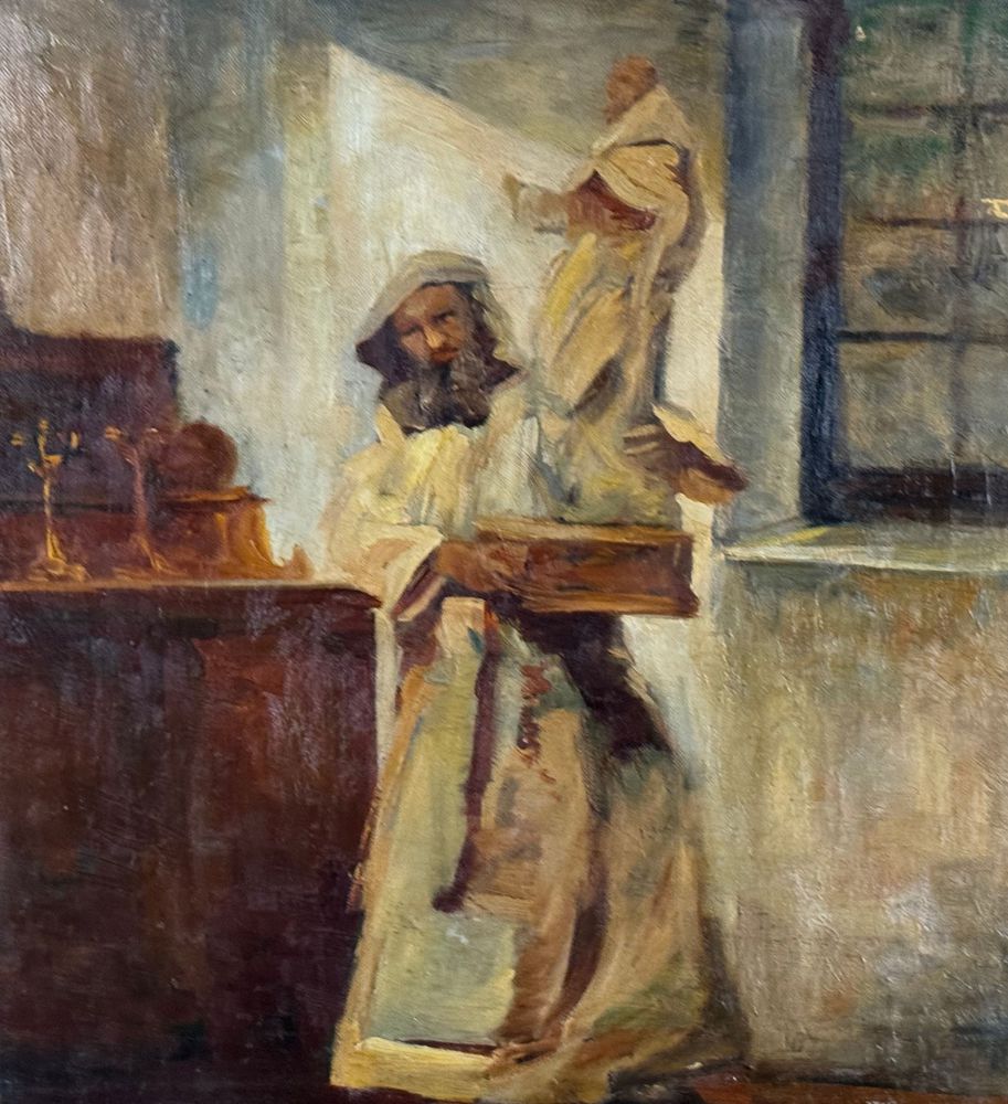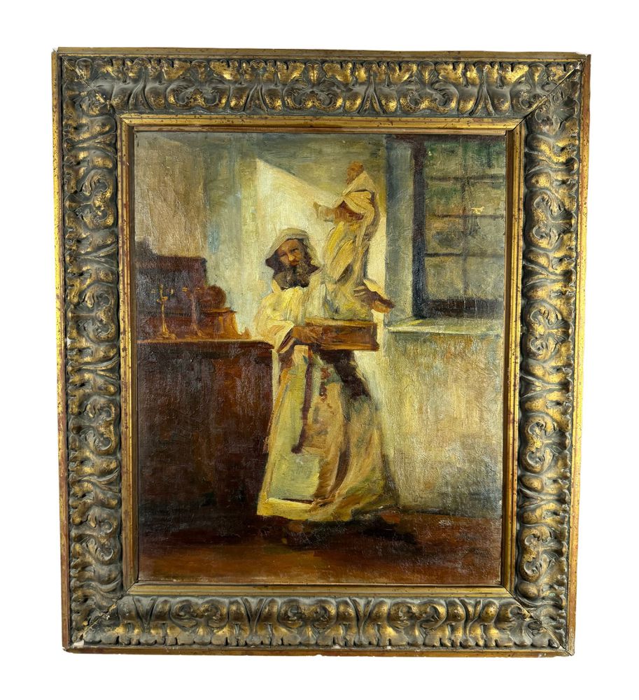 Dipinto olio su tela, periodo XIX secolo scuola Italiana, raffigurante Ritratto di monaco. Dimensioni compreso cornice: 79x90 cm. Dimensioni interno cornice: 55x67 cm. Reca firma in basso a destra da artista non identificato. Opera in buone condizioni.