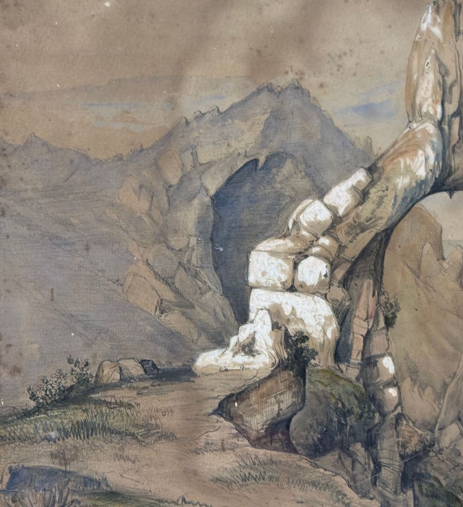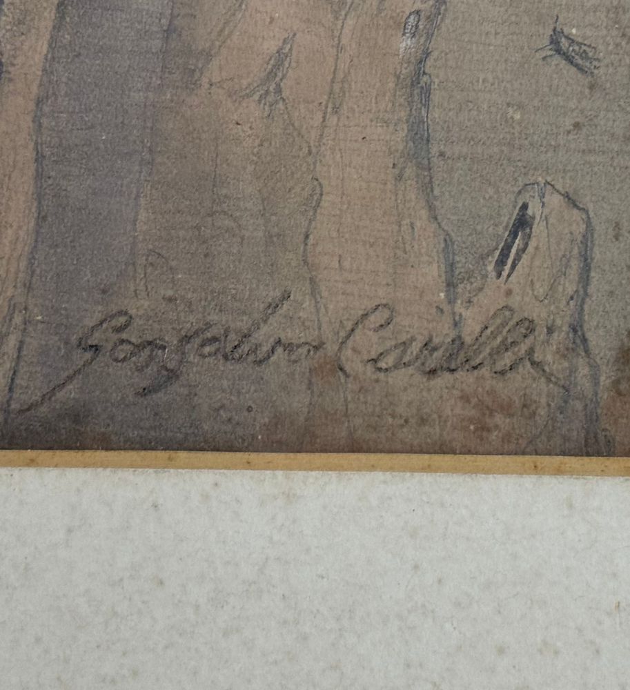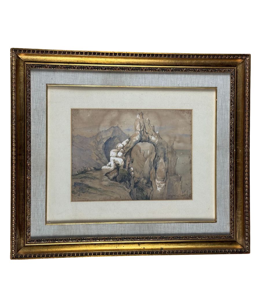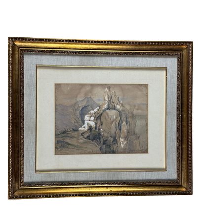 Dipinto acquerello su carta, periodo XIX secolo scuola Italiana, raffigurante Paesaggio roccioso. Dimensioni compreso cornice: 67x57 cm. Dimensioni interno cornice: 35x26 cm. Reca firma Consalvo Carelli in basso a destra. Opera in buone condizioni con lievi segni di vissuto come da foto allegate.