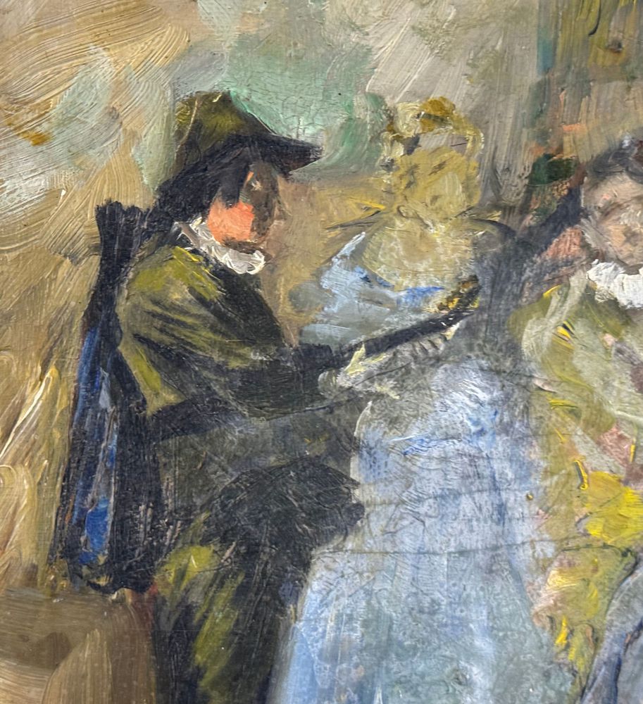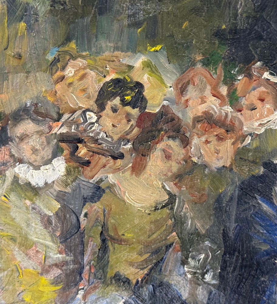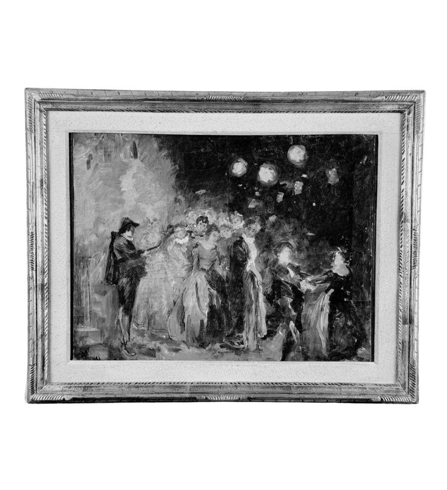 Dipinto olio su tela, periodo prima metà del XX secolo scuola Italiana, raffigurante Personaggi al ballo. Dimensioni compreso cornice: 61x48 cm. Dimensioni interno cornice: 36x46 cm. Da artista anonimo. Opera in buone condizioni con lievi segni di vissuto come da foto allegate.