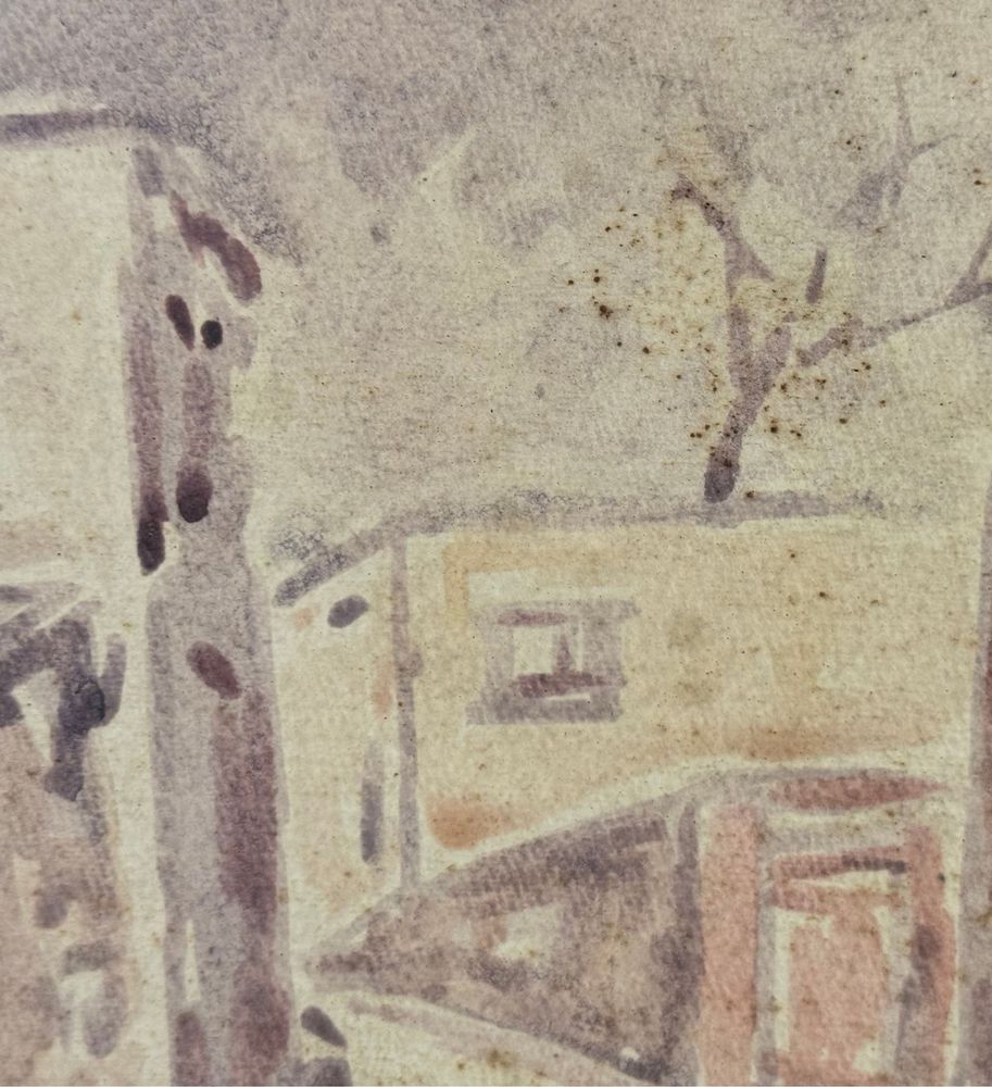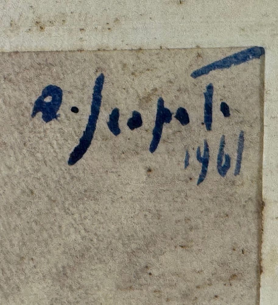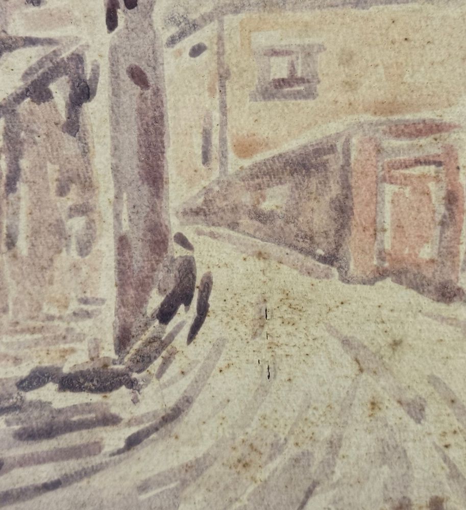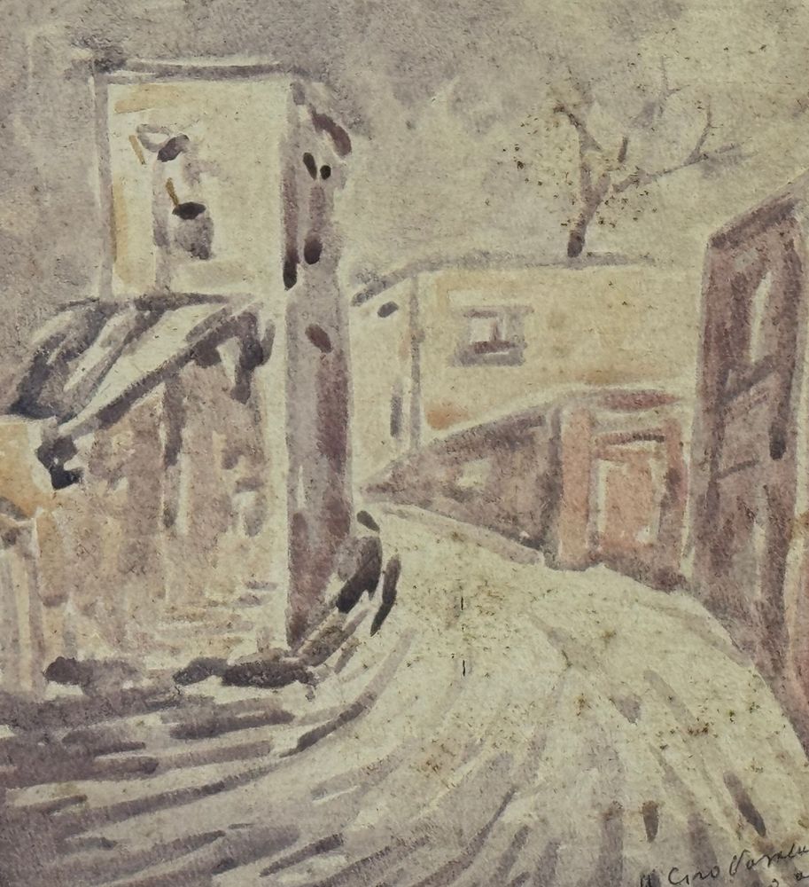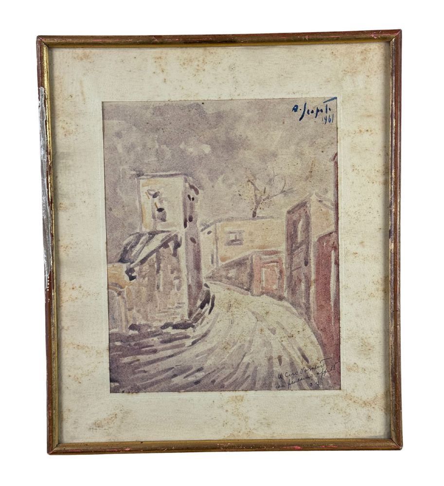 Acquerello su carta, periodo XX secolo scuola Italiana, raffigurante Stradina. Dimensioni compreso cornice: 32x38 cm. Dimensioni interno cornice: 21x26 cm. Reca firma in alto a destra da artista non identificato. Opera in buone condizioni con lievi segni di vissuto come da foto allegate. Reca dedica in basso a destra.