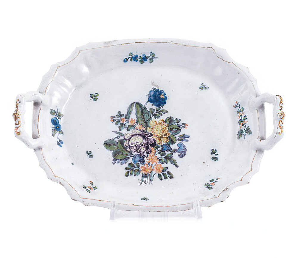 VASSOIO IN MAIOLICA, NOVE DI BASSANO, P.ANTONIBON, 1750 CA., ovale sagomato con manici, decoro policromo a mazzetti di fiori e fiori sparsi.