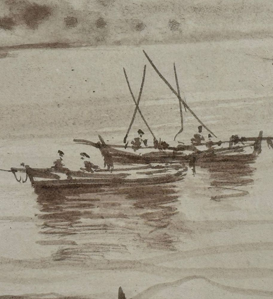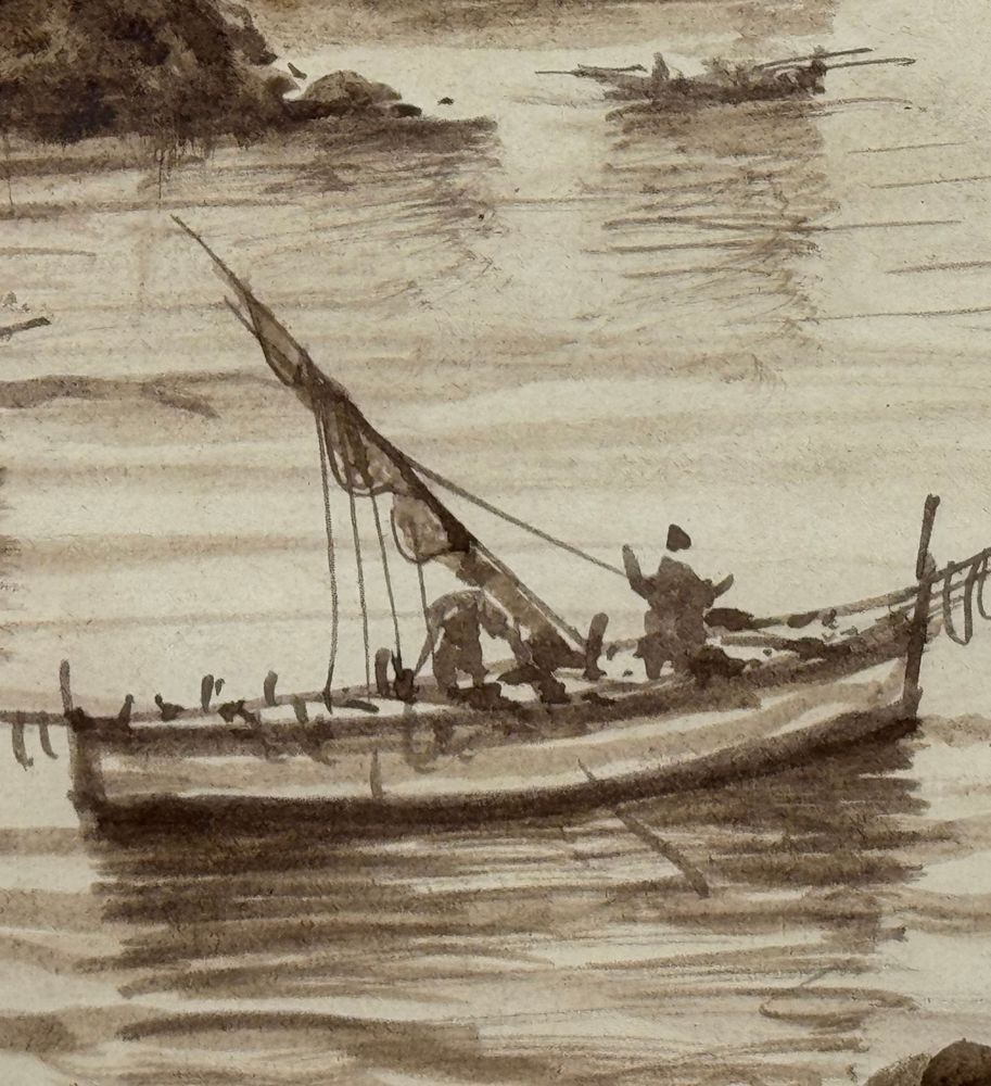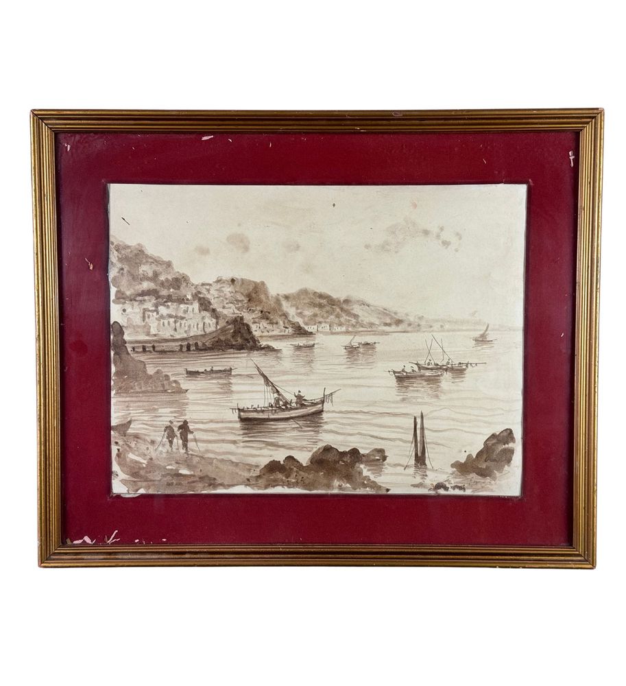Dipinto seppia su carta, periodo XX secolo scuola Italiana, raffigurante Marina con barche. Dimensioni compreso cornice: 53x43 cm. Dimensioni interno cornice: 40x30 cm. Da artista anonimo. Opera in buone condizioni.