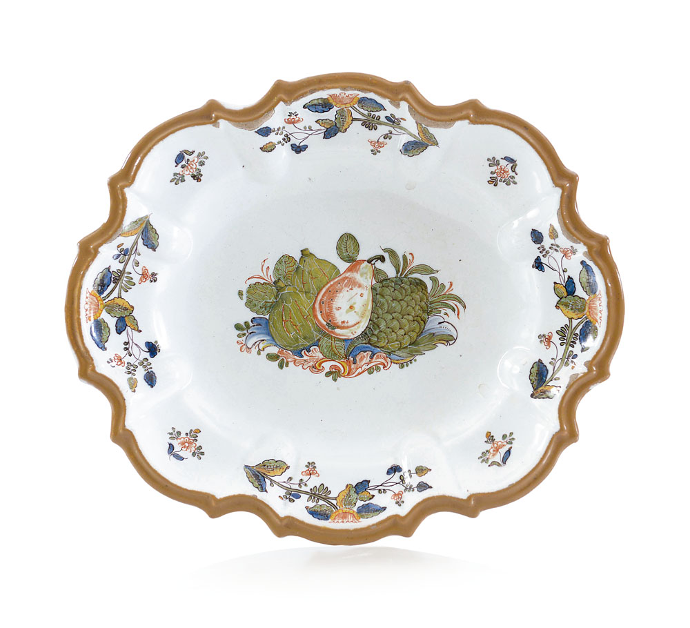 PIATTO OVALE IN MAIOLICA, NOVE DI BASSANO, P.ANTONIBON, 1770 CA., bordo mistilineo e rilevato, decoro policromo alla "frutta barocca"; sbeccatura al retro.