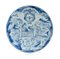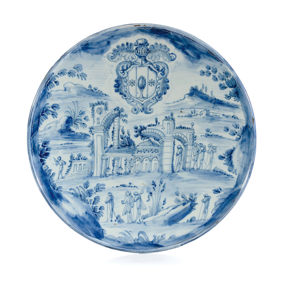 ALZATA IN MAIOLICA, SAVONA, XVIII SECOLO, decoro blu a paesaggio con rovine, astanti e stemma araldico; marcata; lieve rincollatura e fessure.