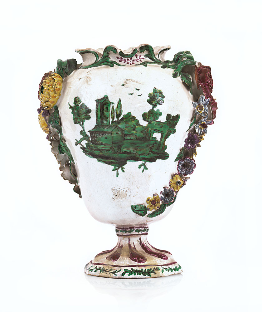 VASO IN MAIOLICA, SAVONA, G.BOSELLI, XVIII SECOLO, piriforme su base ottagonale baccellata con anse a festoni di fiori, decoro in verde con architetture entro paesaggio; restauro alla base e coperchio mancante.