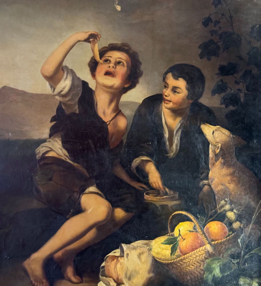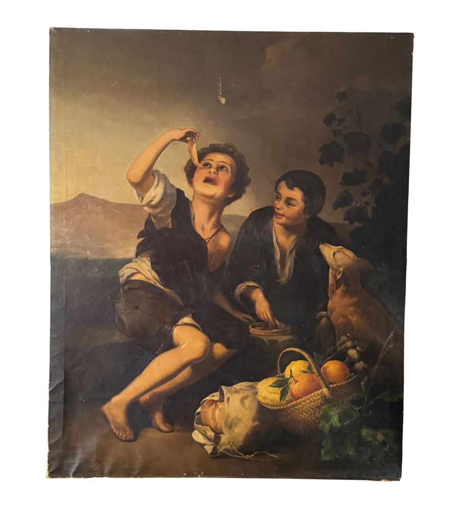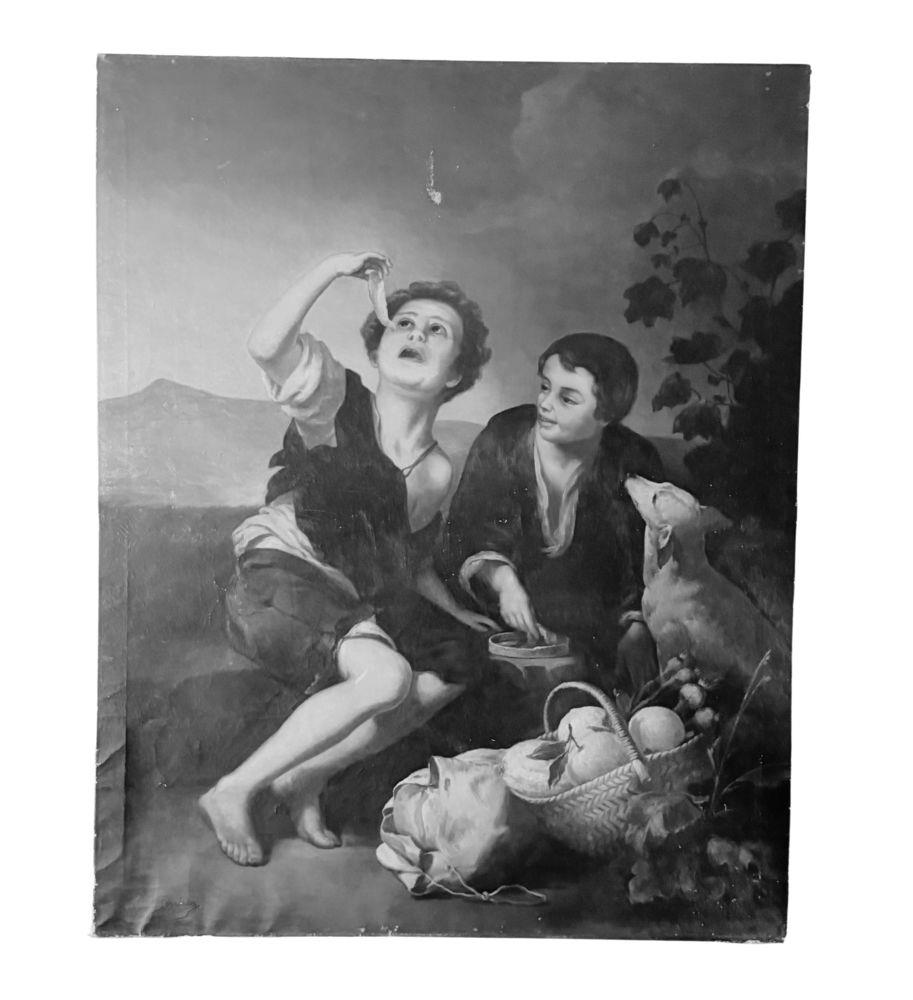Dipinto olio su tela, periodo XIX secolo scuola Spagnola, raffigurante Ritratto di bambini con uva da Bartolomè Esteban Murillo. Dimensioni: 88x110 cm. Reca firma in basso a sinistra da artista non identificato. Opera in buone condizioni con piccoli segni di vissuto come da foto allegate.