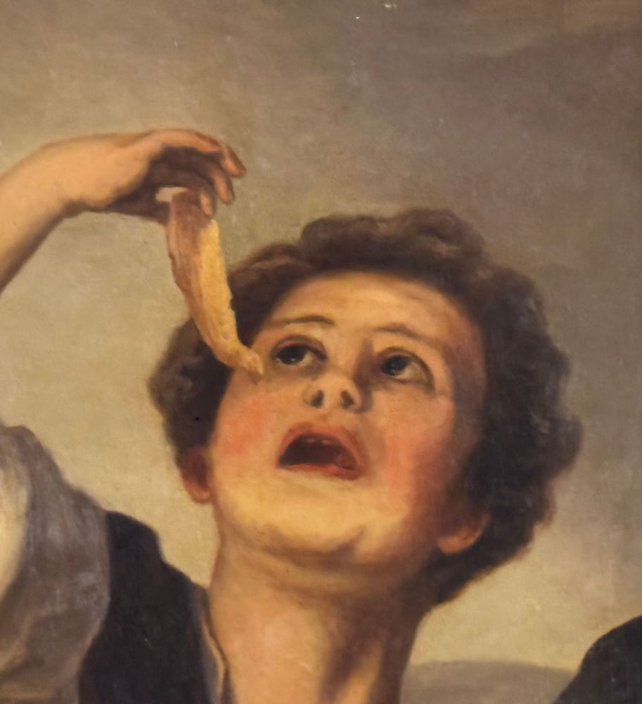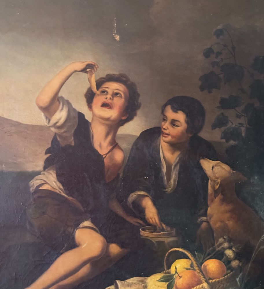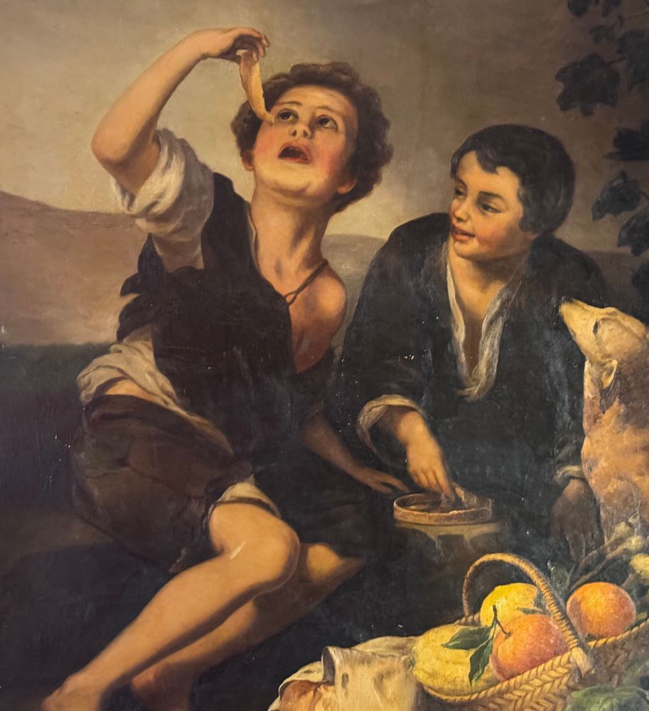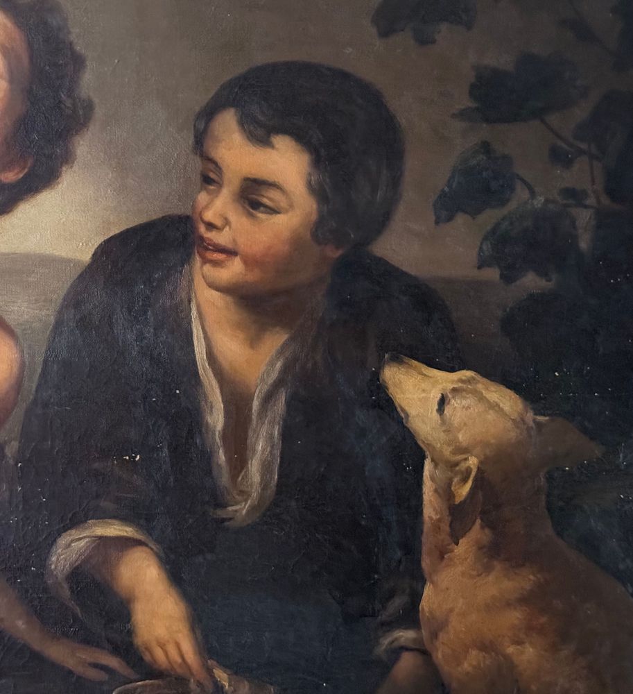 Dipinto olio su tela, periodo XIX secolo scuola Spagnola, raffigurante Ritratto di bambini con uva da Bartolomè Esteban Murillo. Dimensioni: 88x110 cm. Reca firma in basso a sinistra da artista non identificato. Opera in buone condizioni con piccoli segni di vissuto come da foto allegate.