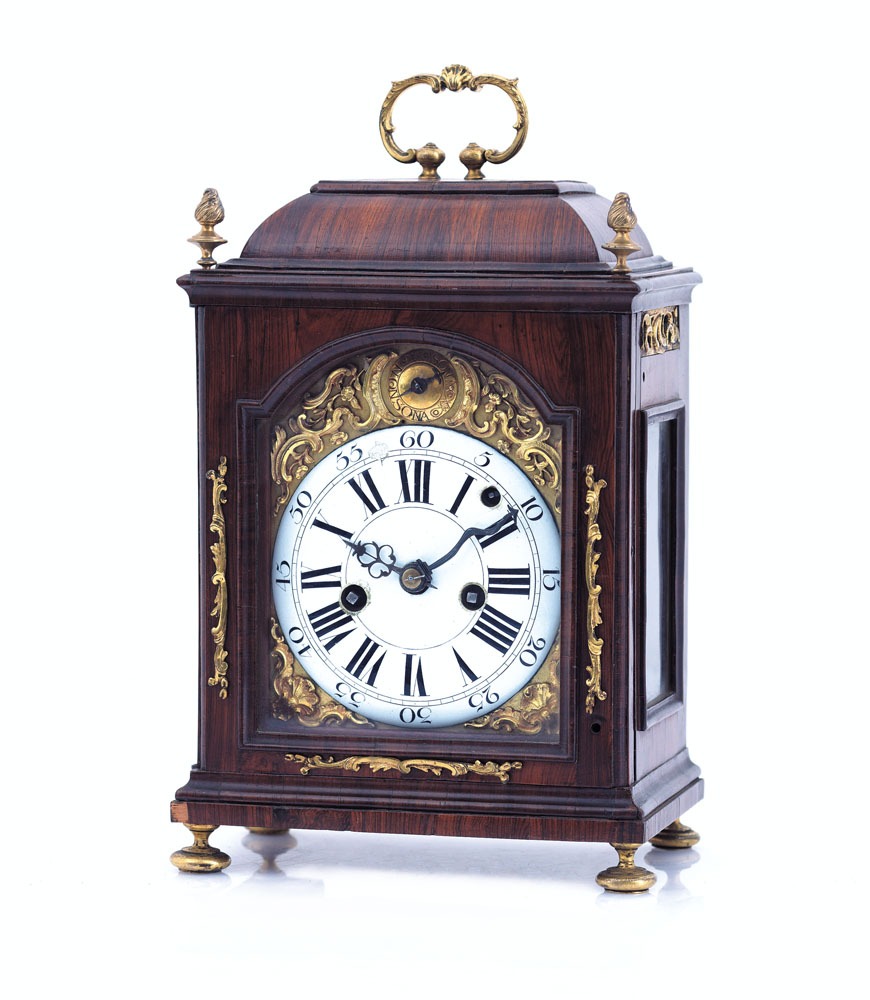 OROLOGIO DA TAVOLO IN PALISSANDRO E BRONZO DORATO, ALTO VENETO, 1750-1780, cassa architettonica con cimature a pinnacoli e maniglia, quadrante smaltato con numeri romani ed arabi, suoneria delle ore dei quarti e della sveglia a richiesta; scappamento ad ancora; da revisionare.