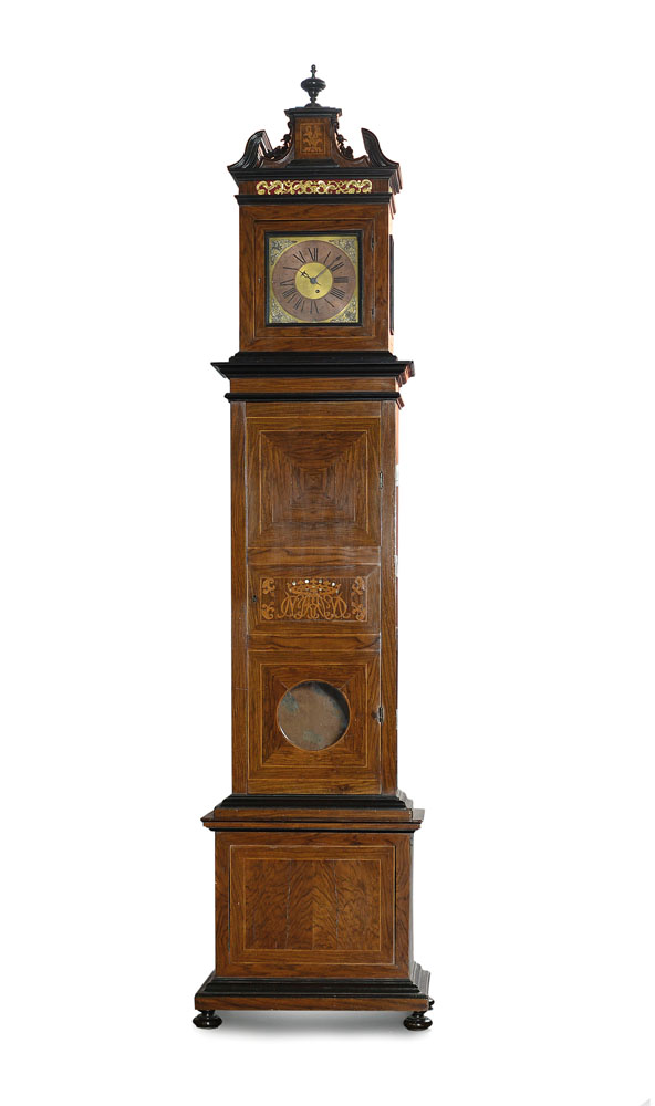 RARO OROLOGIO A COLONNA PROVENIENTE DAL PALAZZO CAPRARA MONTPENSIER A BOLOGNA, GIA' RESIDENZA REALE NAPOLEONICA, XVIII SECOLO, cassa a torre lastronata ad intarsi in legni vari e monogramma centrale con inserti in madreperla, quadrante in ottone dorato con numerazione romana su disco, meccanismo tipo notturno firmato con monogramma "A.E.W" a scappamento ad ancora piccola con peso, suoneria da 6 a 6 con ribotta a molla; all'interno reca marchio a fuoco "N" coronata (Napoleone I), doppio marchio "MR" (Mobilier Royal), etichette "1823 Palazzo di S.A.R. La Duchessa di Galliera Marca dell'Ambiente n. 38 Marca dell'Inventario n.258" e "Palazzo R.di Bologna Camera n.238 n.1412"; usure e lievi sbeccature.