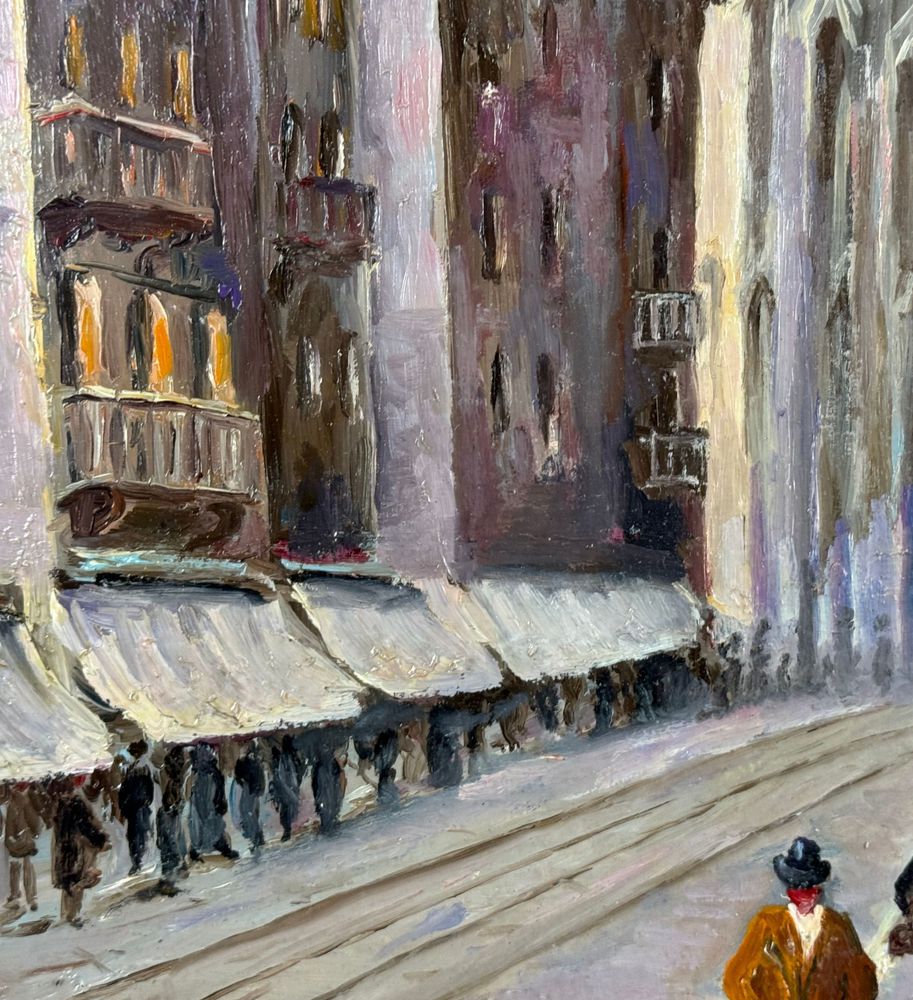 Dipinto olio su tela, periodo XX secolo scuola Italiana, raffigurante Milano. Dimensioni compreso cornice: 43x53 cm. Dimensioni interno cornice: 30x40 cm. Reca firma in basso a destra da artista non identificato. Opera in buone condizioni. Cornice difetti e mancanze.